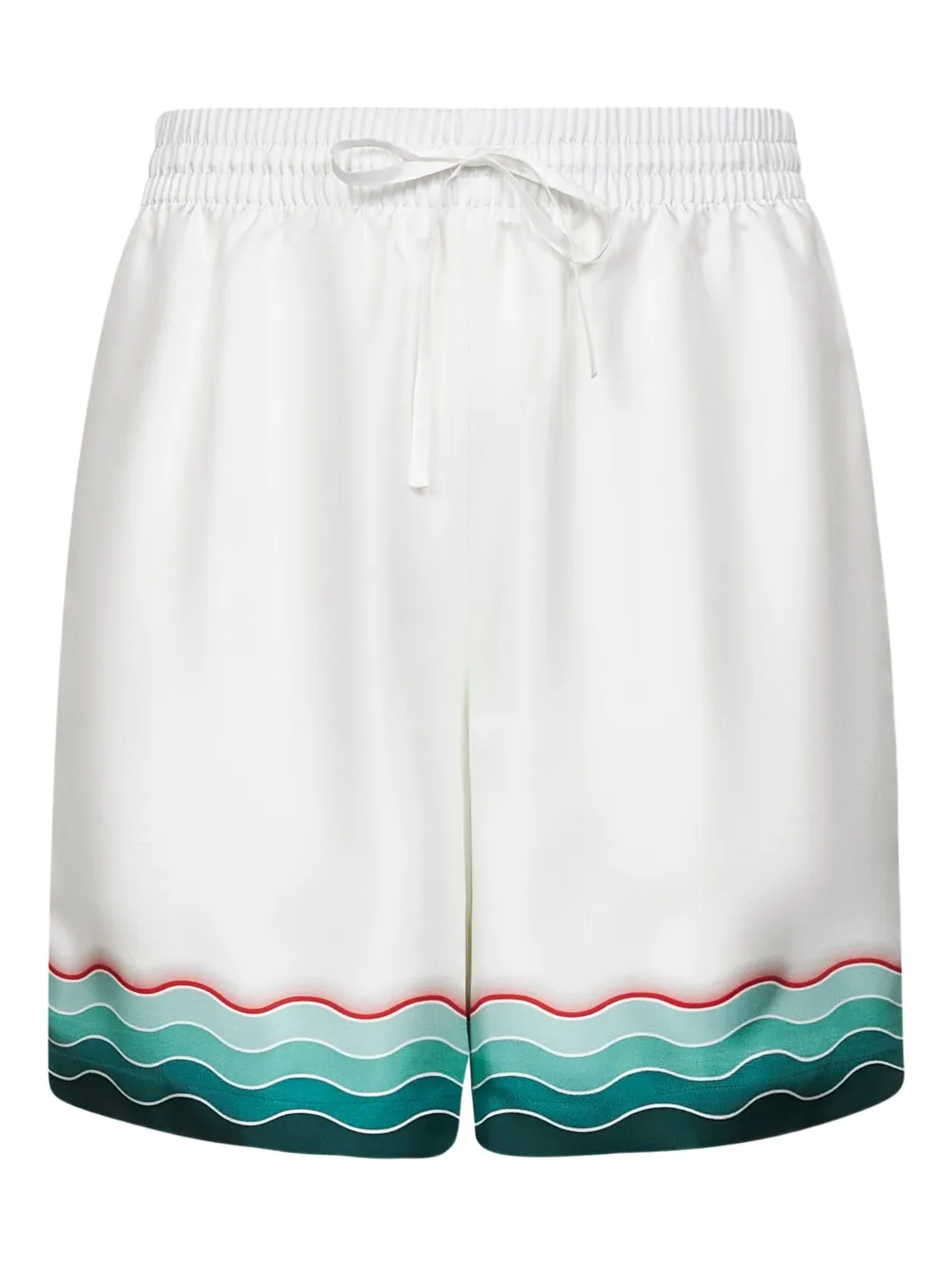 blanc ceinture élastique lien de resserrage poches latérales passepoilées poche plaquée au dos imprimé ondulé œuvre Montagne Ondulée