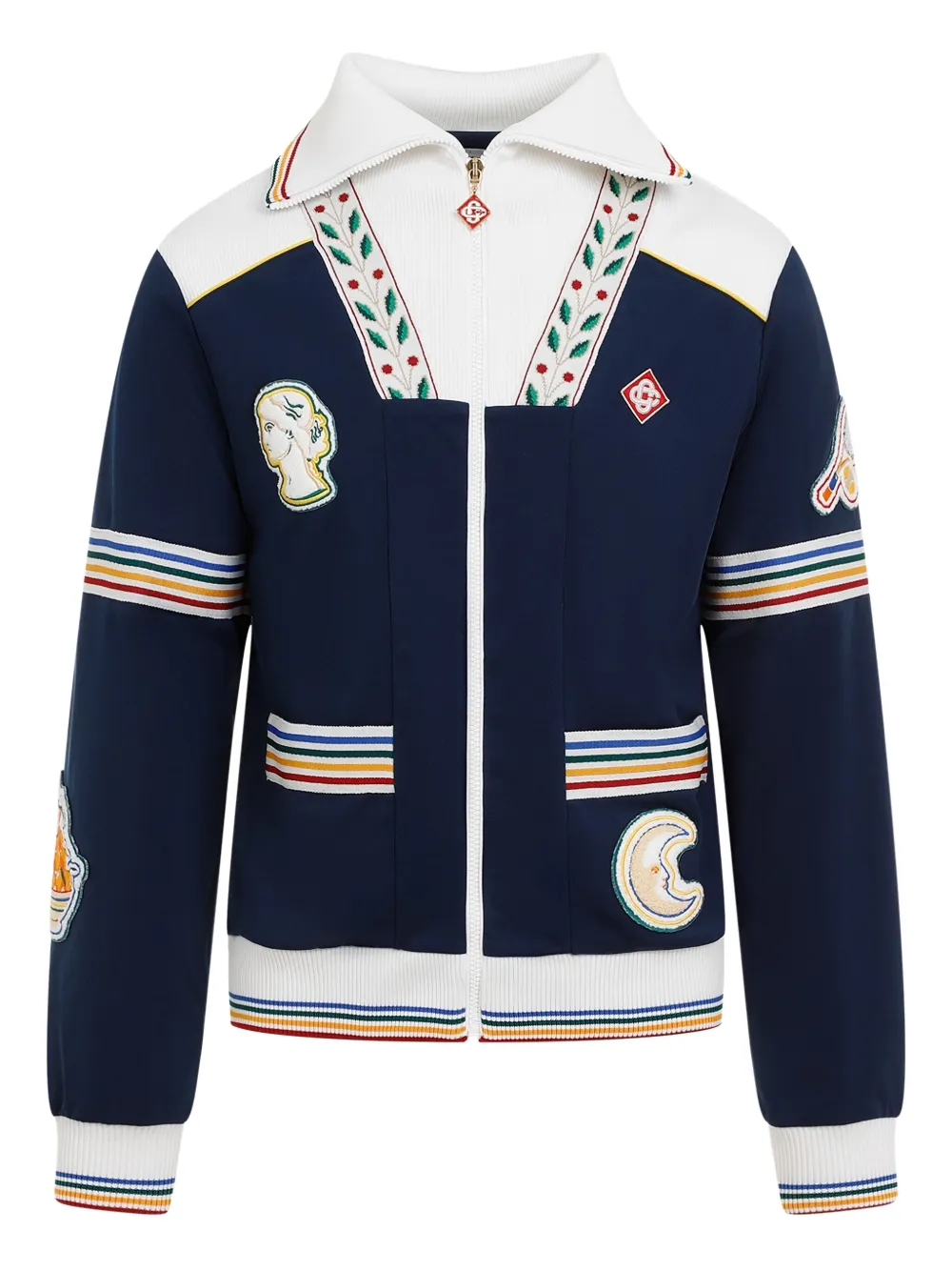bleu marine/blanc design colour block empiècements en maille fermeture zippée devant détails rayés col montant patch poitrine à logo détail de patch deux poches à rabat manches longues ourlet et bords nervurés doublure en résille