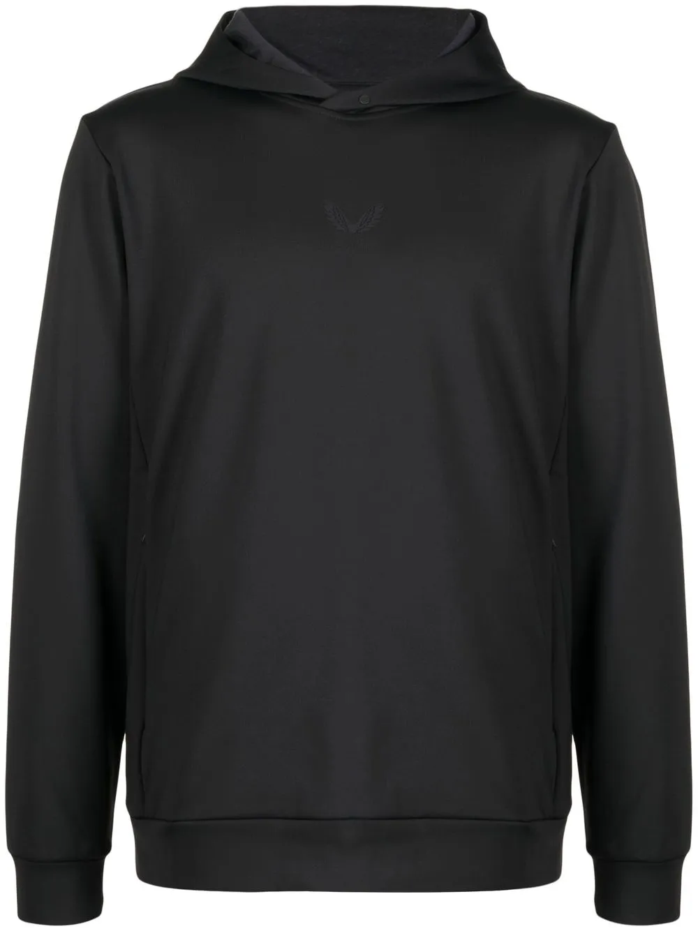 Noir, construction stretch, capuche classique, logo imprimé sur le devant, manches longues, ourlet droit.