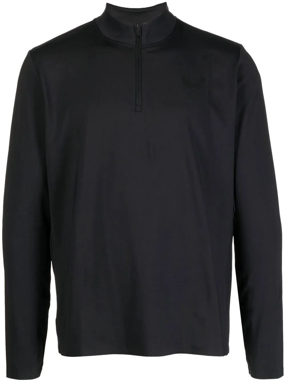 Noir, construction stretch, design ton sur ton, léger, logo imprimé à la poitrine, col montant, fermeture zippée sur le devant, manches longues, ourlet droit.