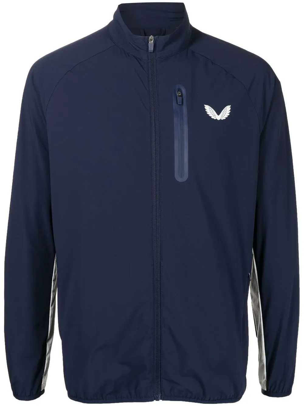 Bleu marine, logo imprimé à la poitrine, logo imprimé à l’arrière, fermeture zippée devant, manches longues, poche poitrine zippée, deux poches latérales zippées.