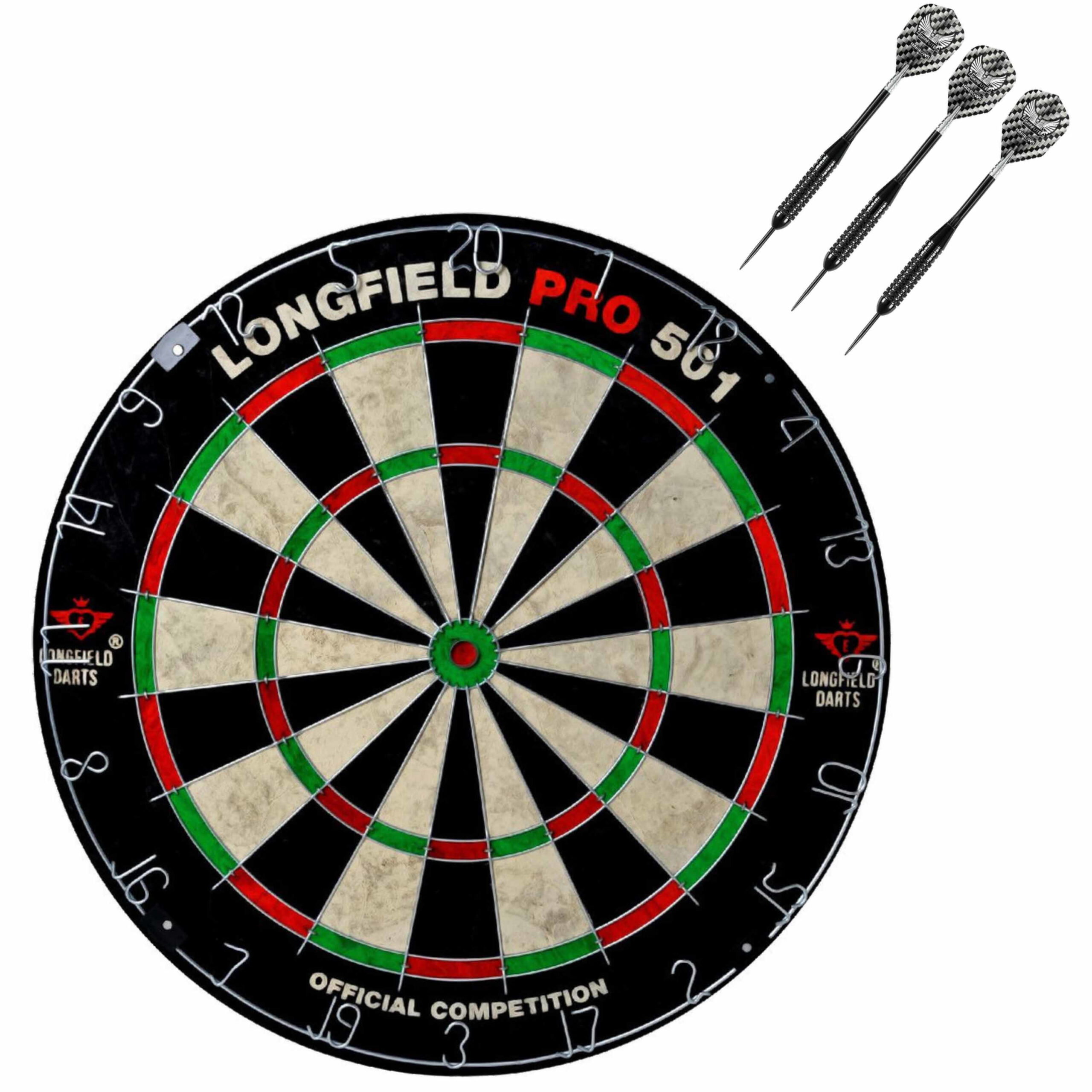 Dartbord set compleet van 45.5 cm met 3x Black Arrow dartpijlen van 25 gram. Dartbord van Longfield professional met diameter 45.5 cm. Wedstrijd dartbord met ronde draad. Geschikt voor personen vanaf 10 jaar oud. Professioneel darten doe je thuis of buiten in de tuin. De Black Arrow dartpijlen hebben een stalen punt, een Pvc shaft en wordt standaard geleverd met Harrows Graflite flights. , Dit artikel bestaat uit:, 1x Longfield professional dartbord – 45.5 cm – hoge kwaliteit – wedstrijd bord pro 501, 1x 1x Set van 3 dartpijlen Black Arrow 25 grams