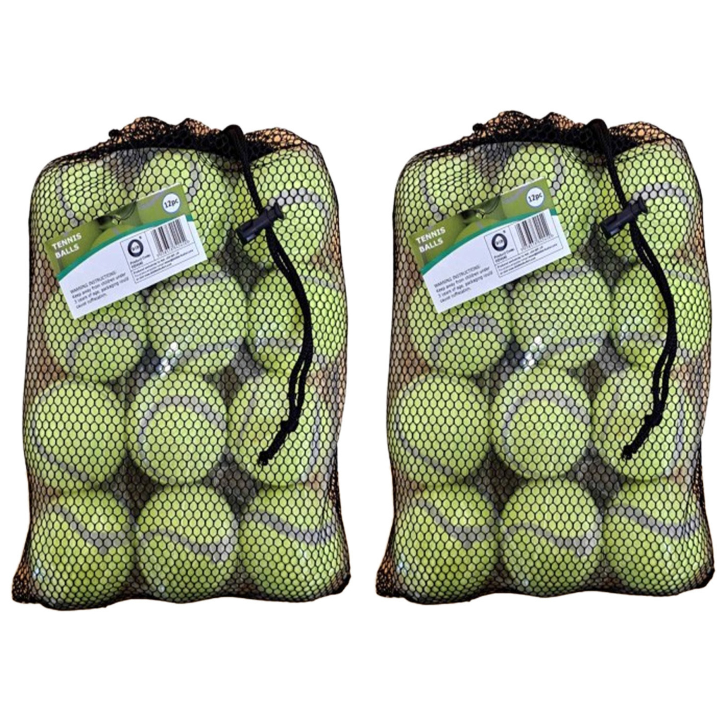 DID Tennisballen – 24x – geel – rubber/katoen – standaard formaat – buitenspeelgoed. Deze set van 12 gele tennisballen is ideaal voor sport en spel in de buitenlucht. Gemaakt van een combinatie van rubber en katoen bieden ze de juiste stuiter en grip voor zowel recreatief als sportief gebruik. Perfect voor tennis, maar ook geschikt voor spelletjes met kinderen of huisdieren. Dankzij het voordeelpakket ben je in ??n keer goed voorzien voor lange speelsessies in de tuin, op het plein of op de baan. Geschikt voor jong en oud en eenvoudig mee te nemen.