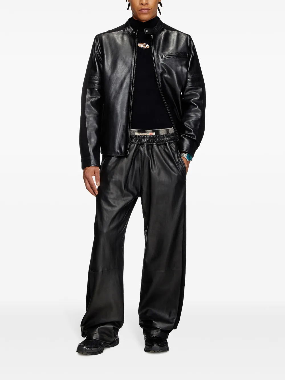 zwart schapenleer vlakken tweeweg ritssluiting aan de voorkant bandkraag lange mouwen met manchetten met knopen drie zakken met ritssluiting aan de voorkant rechte zoomDit product is gemaakt van leer dat is geproduceerd in een gecertificeerde Leather Working Group (LWG) of ICEC leerlooierij, zodat het productieproces minder impact op het milieu heeft.