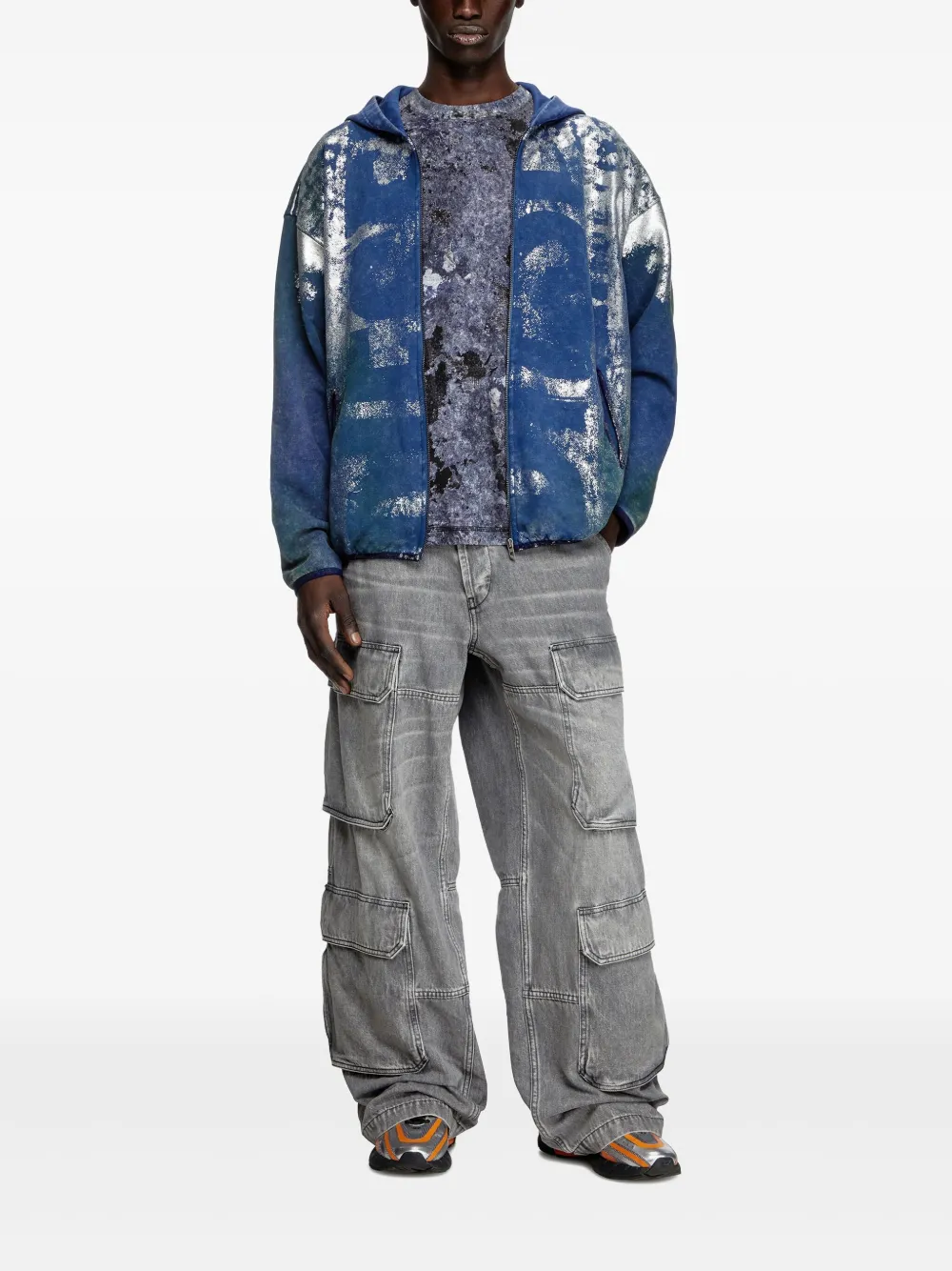 blauwgroen blauw ritssluiting aan de voorkant all-over grafische print gerafeld effect klassieke capuchon