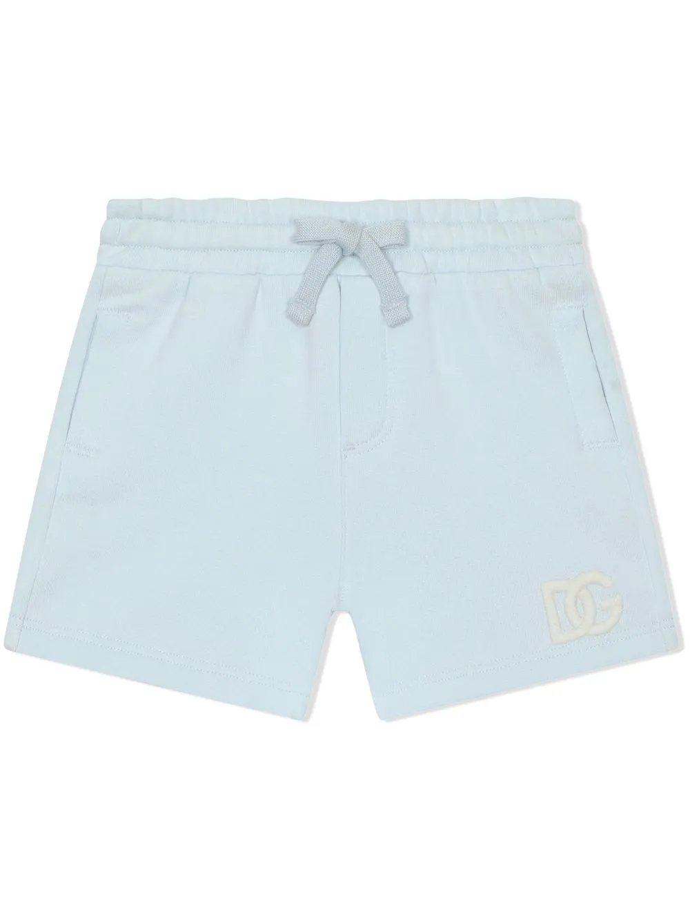 Bleu pastel, blanc ivoire, coton, logo brodé sur le côté, taille élastique à lien de resserrage, deux poches passepoilées latérales.