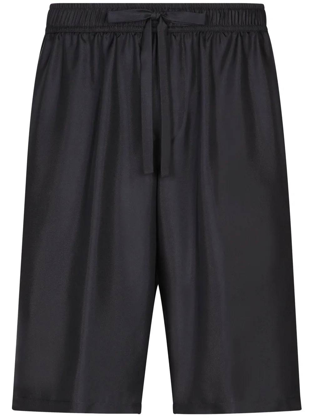 bleu nuit soie détails passepoilés taille élastique à lien de resserrage poches plaquées latérales poche arrière boutonnée coupe droite ourlet droit