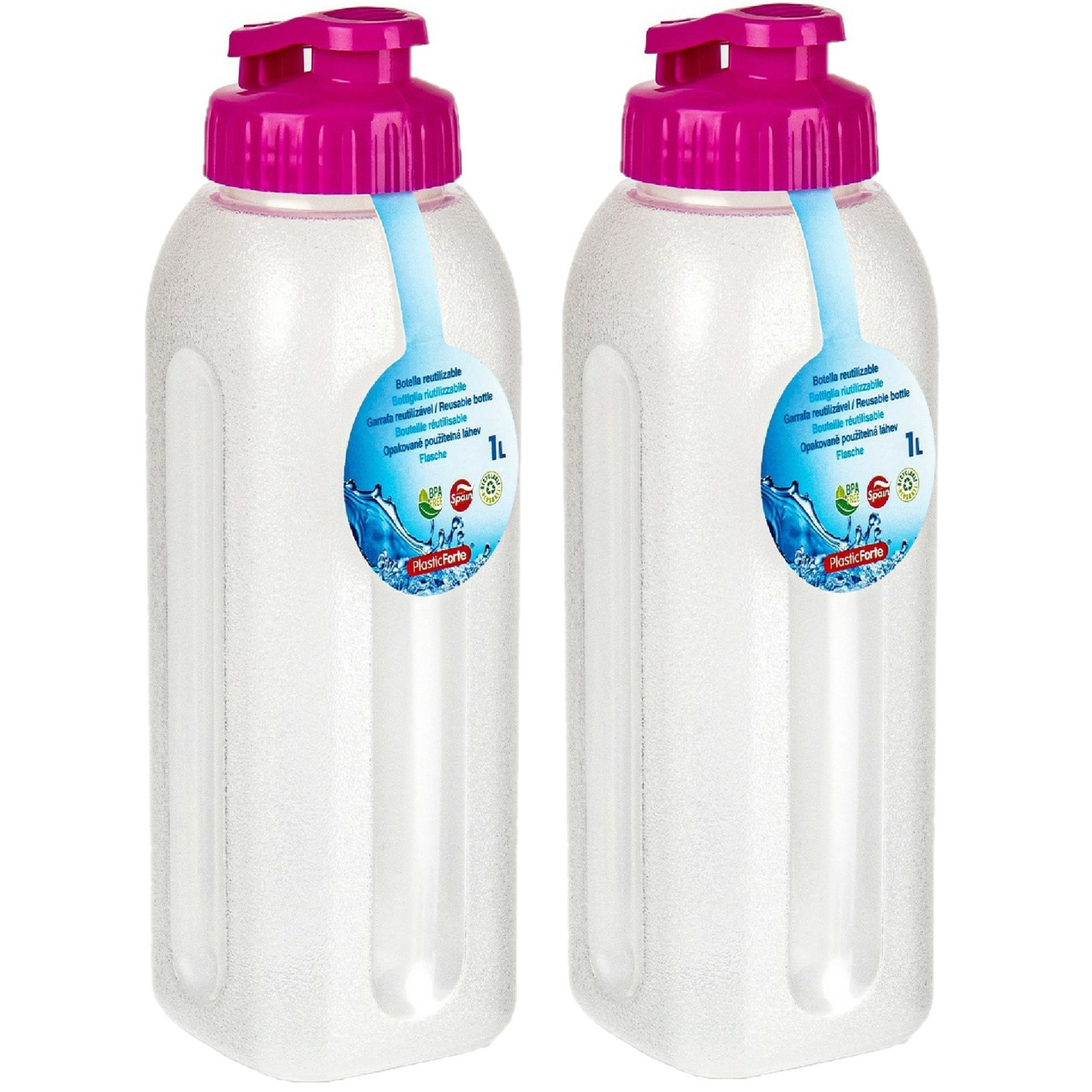 Drinkfles/bidon/waterfles 2x met een inhoud van 1000 ml, gemaakt van transparant kunststof met afsluitdop in het roze. Handige multifunctionele drinkfles voor sapjes en water. Voor recreatie en/of sport. Formaat: 25 x 8 cm. Kan in de vriezer en magnetron gebruikt worden.