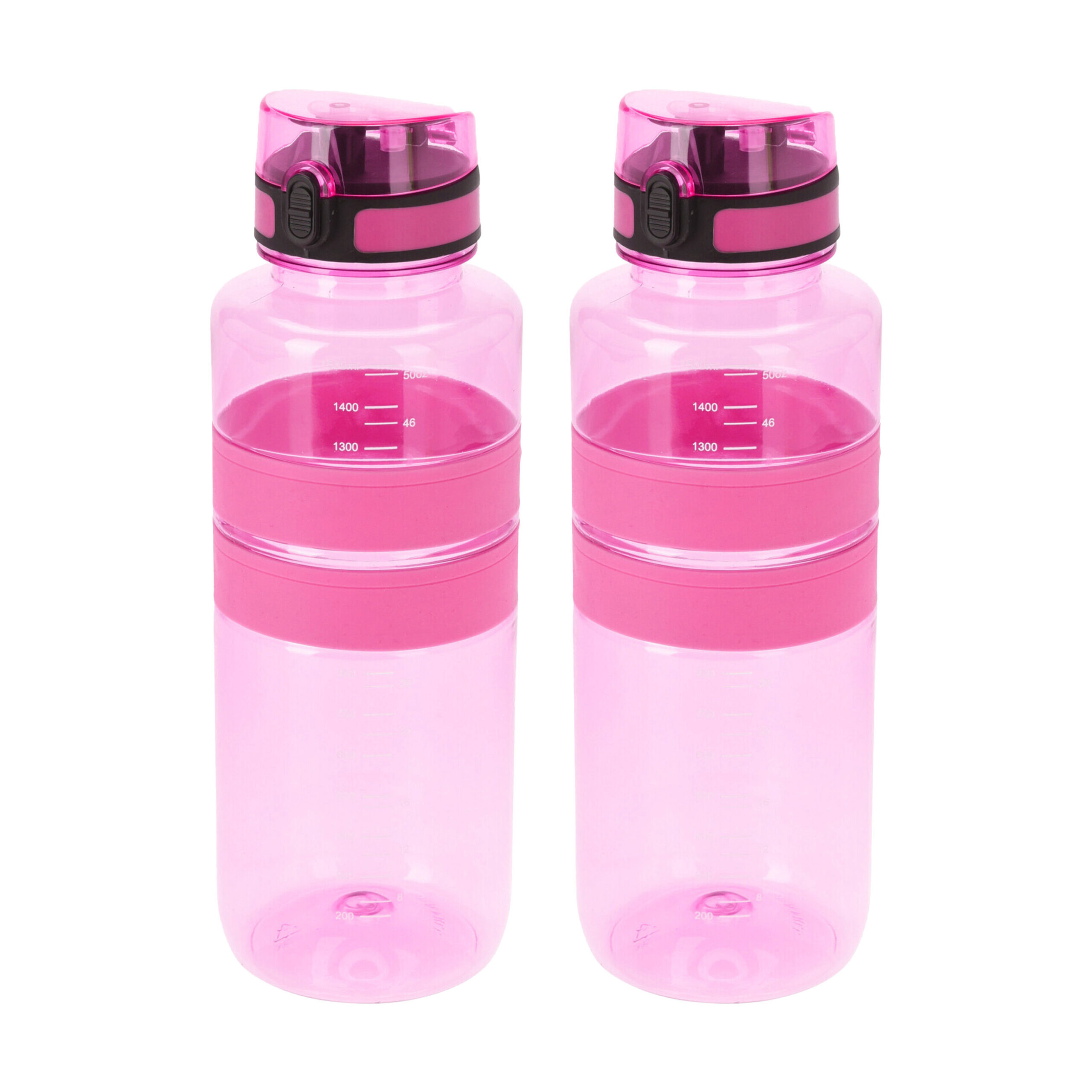 2x stuks drinkfles/bidon/waterfles met een inhoud van 1500 ml, gemaakt van transparant kunststof met afsluitdop in het roze. Handige multifunctionele drinkfles voor sapjes en water. Voor recreatie en/of sport. Formaat: 28 x 9 cm. Kan in de vriezer en magnetron gebruikt worden.