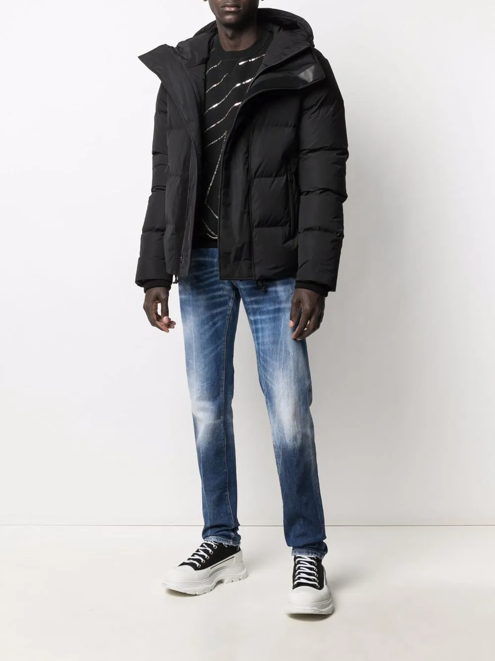 Logoprint op de voorkant, gewatteerd design, klassieke capuchon, lange mouwen, verborgen ritssluiting aan de voorzijde en twee zijzakken met ritssluiting. Materiaal: katoen.
