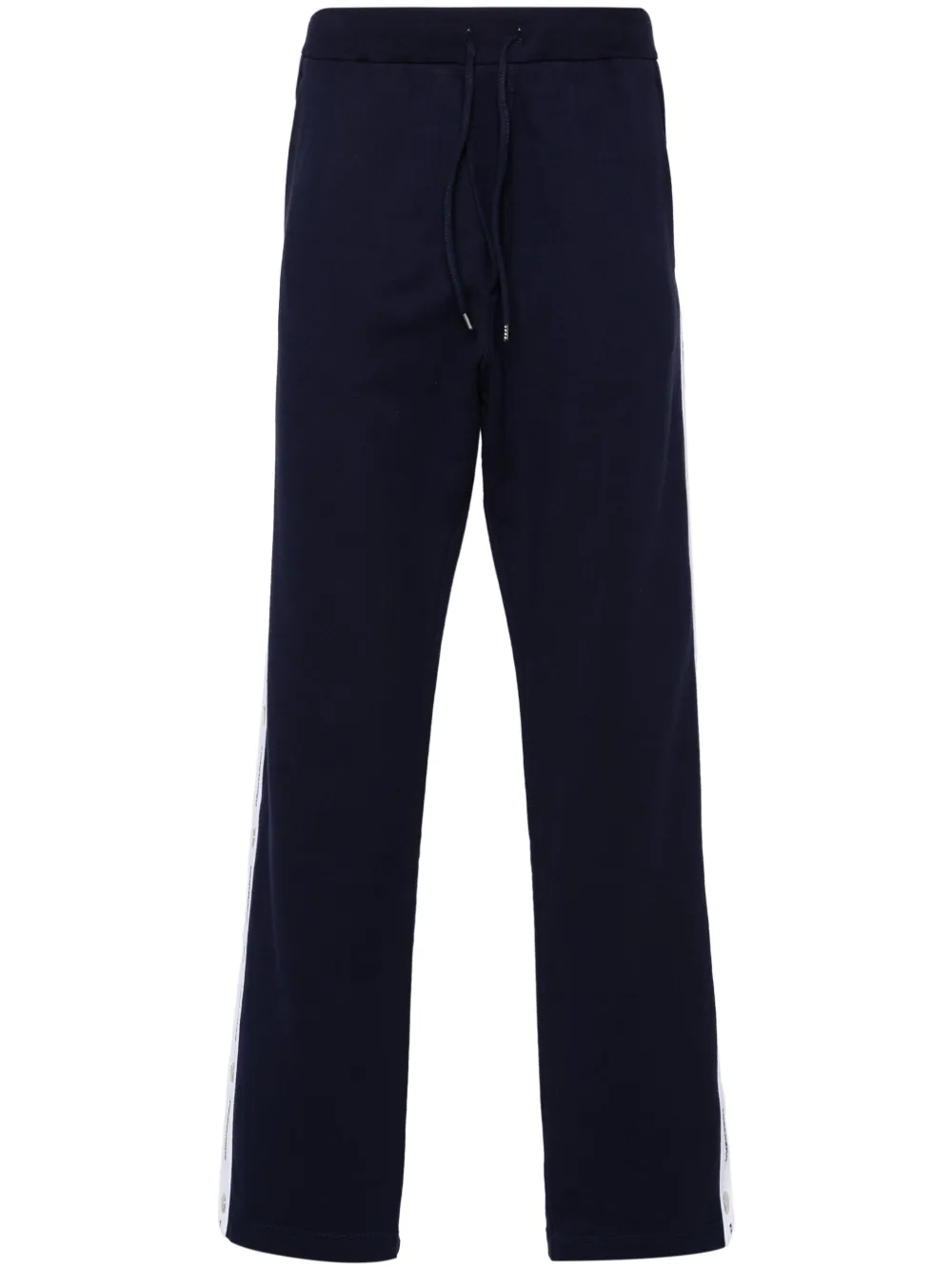 bleu marine coton texture jersey bande logo sur le côté poches latérales fendues fentes latérales à boutons pression coupe longue poche arrière passepoilée doublure French en éponge coupe droite taille élastique à lien de resserrage