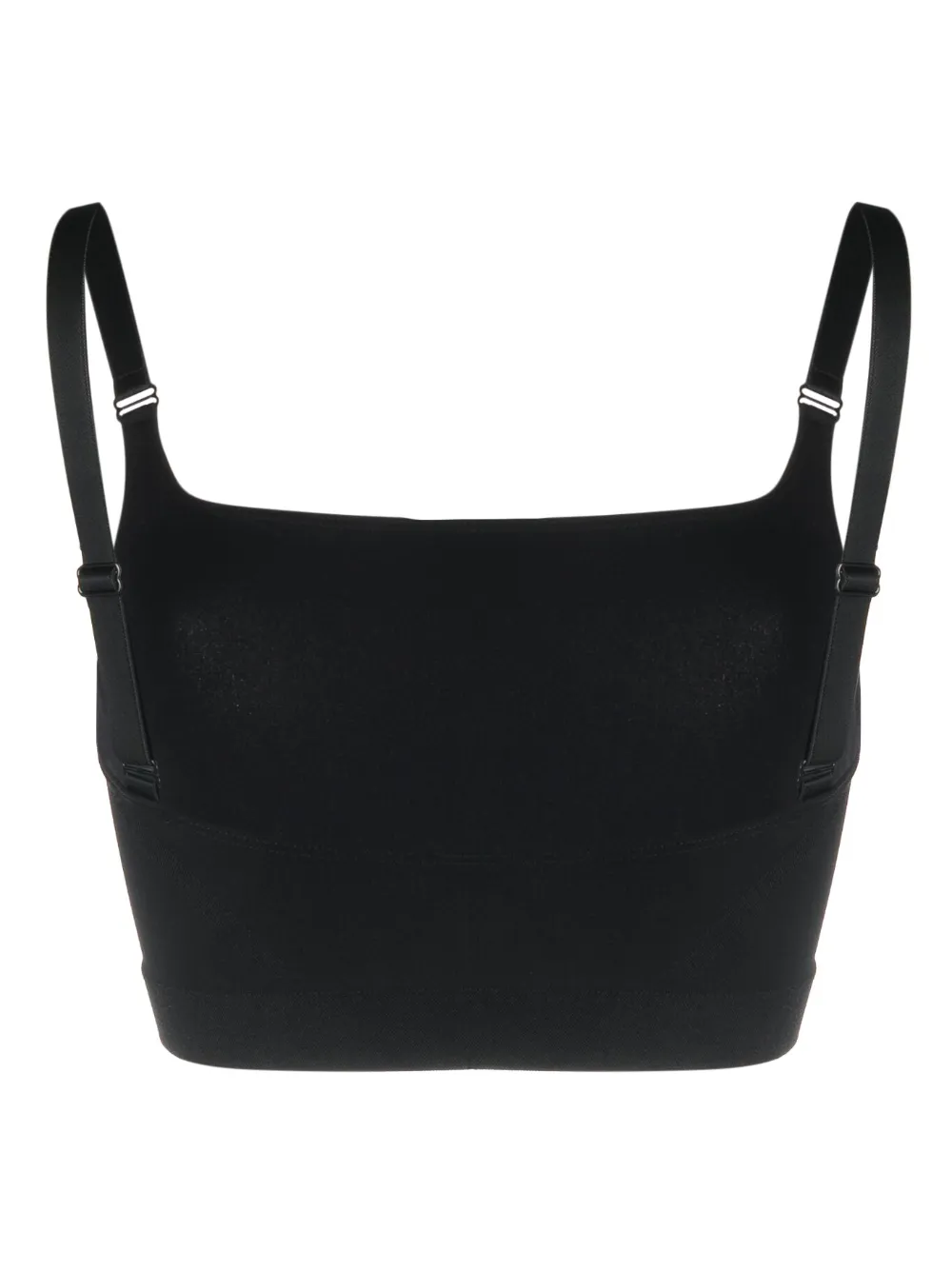 Zwart, stretch design, band met logo, vierkante hals, spaghettibandjes, rechte zoom en cropped.