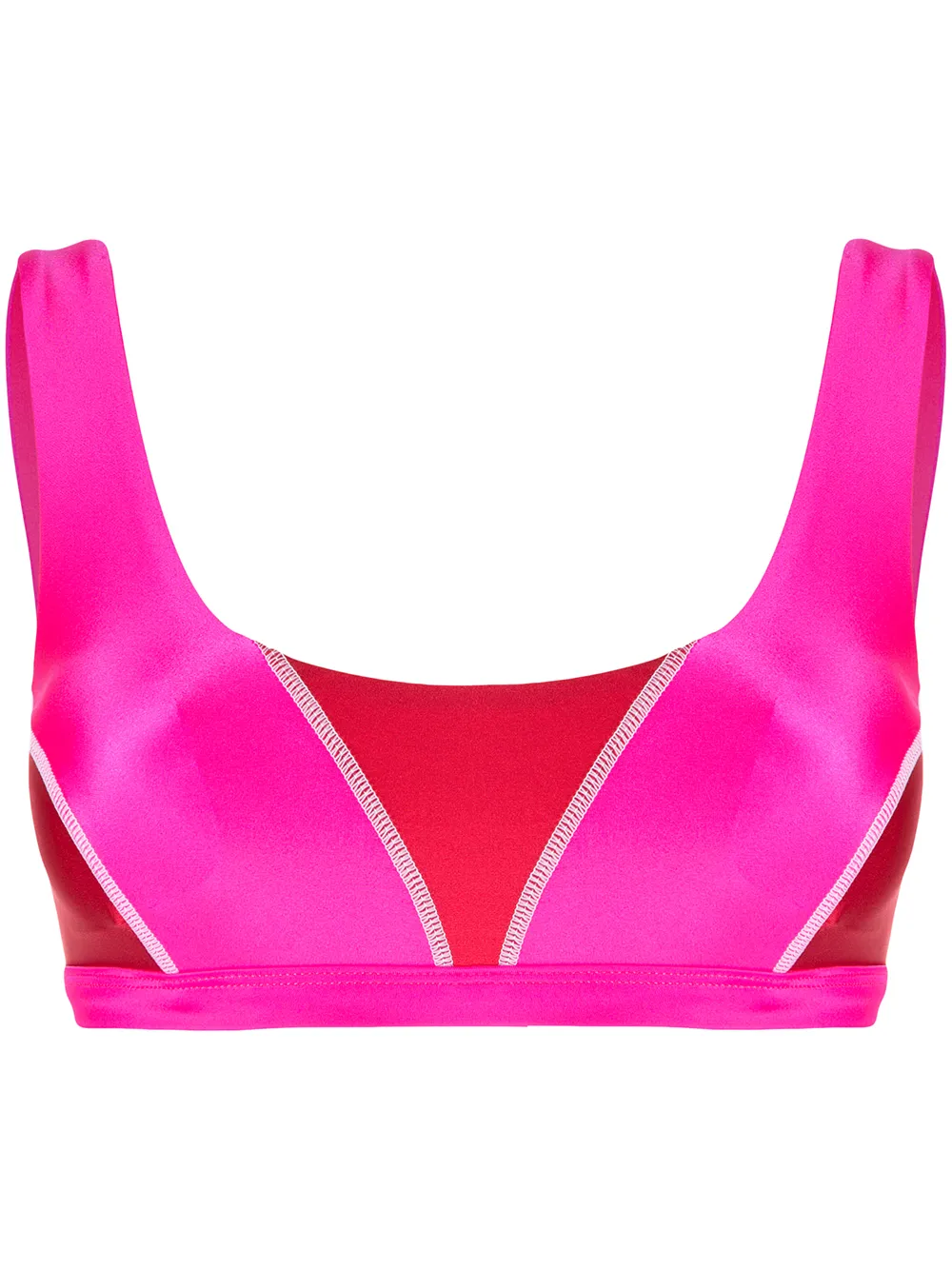 Construction stretch, modèle bicolore, coutures contrastantes, encolure arrondie, décolleté arrondi dans le dos, fermoir crochet à l’arrière.