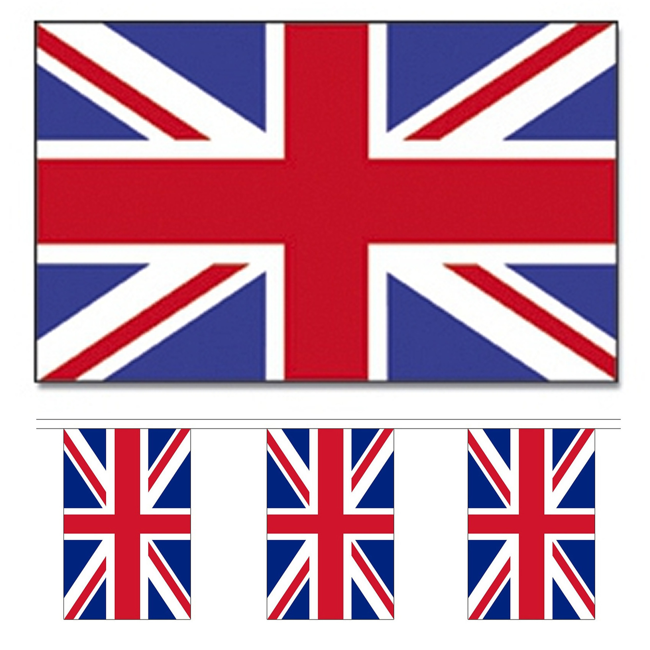 Engeland/UK/Groot Brittanie/union Jack vlaggen versiering set binnen/buiten 2-delig. Deze decoratie vlaggen feestartikelen pakket bestaat uit een landenvlag met ophangringen van 90 x 150 cm en een polyester vlaggenlijn met vlaggetjes van 9 meter. Landen thema voor sport/landen liefhebbers en supporters. , Dit artikel bestaat uit:, 1x Vlag Verenigd Koninkrijk – 90 x 150 cm – Britse Vlag – United Kingdom / UK, 1x Luxe landen vlaggenlijn Groot Brittannie/Engeland 9 meter