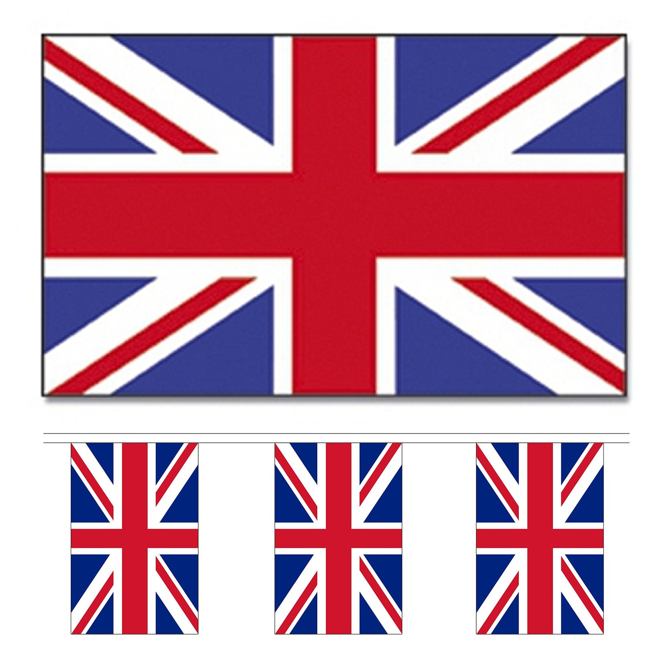 Engeland/UK/Groot Brittanie/union Jack vlaggen versiering set binnen/buiten 2-delig. Deze decoratie vlaggen feestartikelen pakket bestaat uit een landenvlag met ophangringen van 90 x 150 cm en een polyester vlaggenlijn met vlaggetjes van 3 meter. Landen thema voor sport/landen liefhebbers en supporters. , Dit artikel bestaat uit:, 1x Vlag Verenigd Koninkrijk – 90 x 150 cm – Britse Vlag – United Kingdom / UK, 1x Luxe landen vlaggenlijn Groot Brittannie/engeland 3 meter