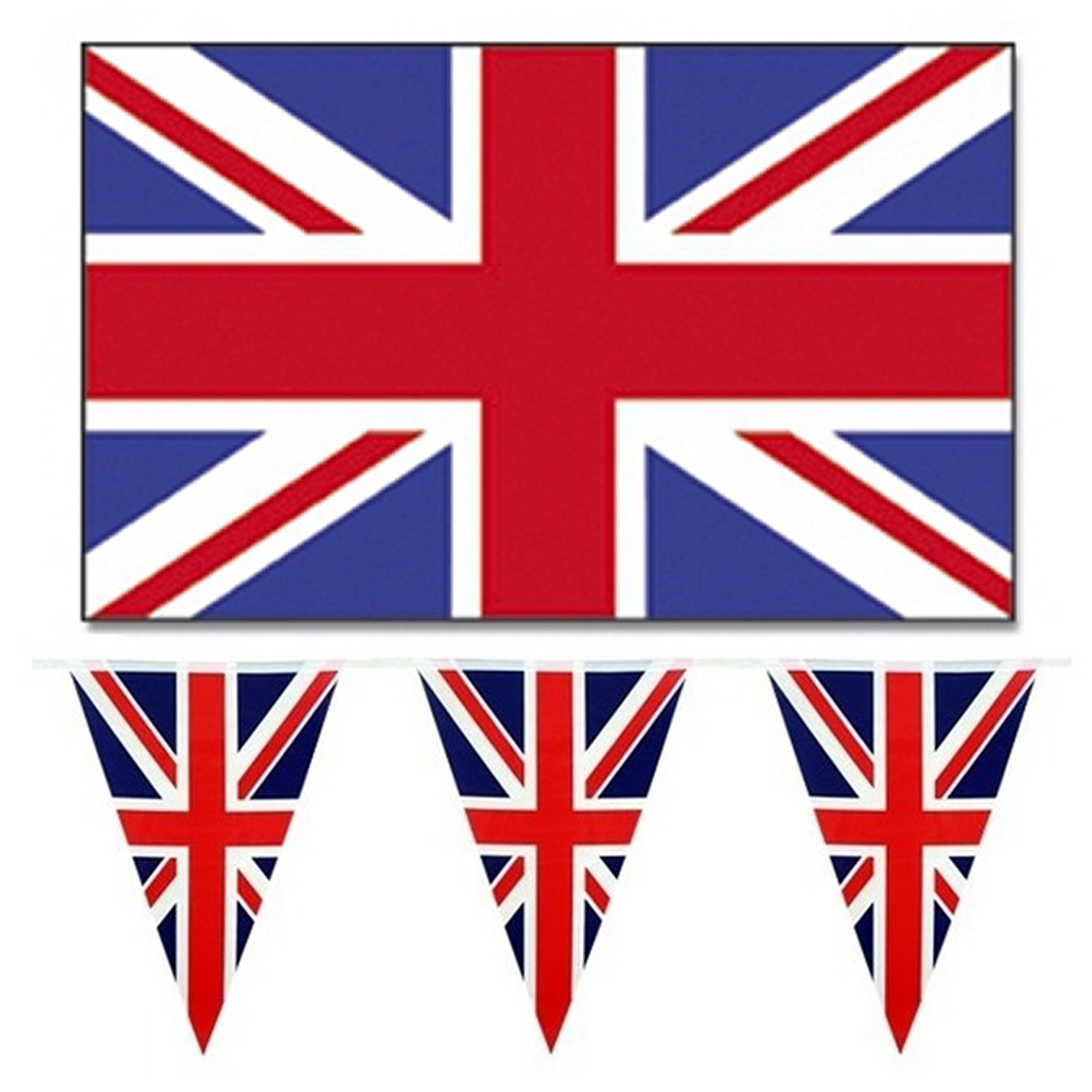 Engeland/UK/Groot Brittanie/Union Jack vlaggen versiering set binnen/buiten 3-delig. Deze decoratie vlaggen feestartikelen pakket bestaat uit een landenvlag met ophangringen van 90 x 150 cm en 2x een plastic vlaggenlijn met plastic puntvlaggen van 10 meter. Landen thema voor sport/landen liefhebbers en supporters. , Dit artikel bestaat uit:, 1x Vlag Verenigd Koninkrijk – 90 x 150 cm – Britse Vlag – United Kingdom / UK, 2x Vlaggenlijn Engeland – landen thema versiering – 10 meter – puntvlaggetjes slinger