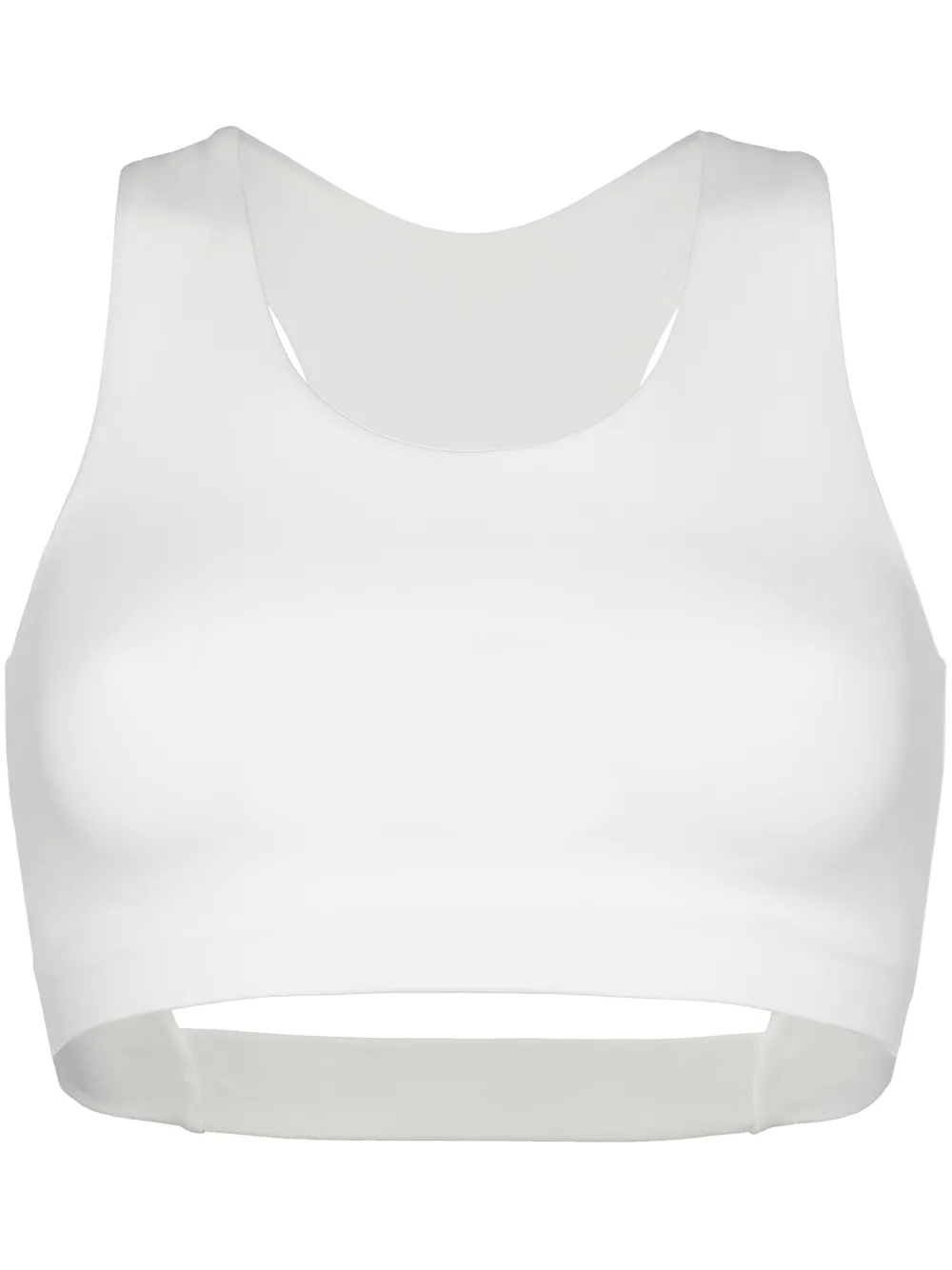 blanc jersey stretch col rond rembourrage amovible design sans manches coupe courte dos nageur petit logo ton sur ton brodé à l’arrière détails de découpes bride élastique à l’arrière doublure intégrale ourlet droit à enfiler