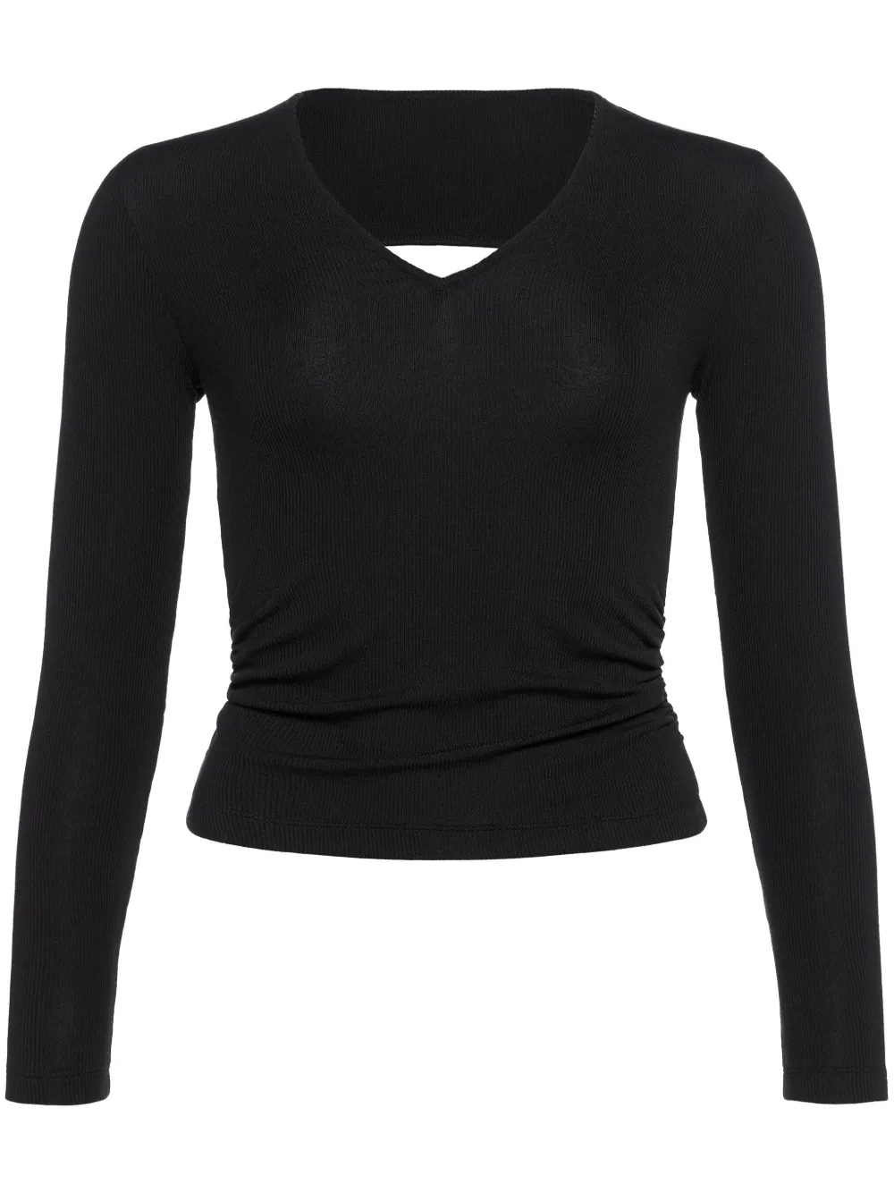 noir soie mélangée fines nervures logo brodé à l’arrière détails de fronces col v manches longues dos-nu coupe courte