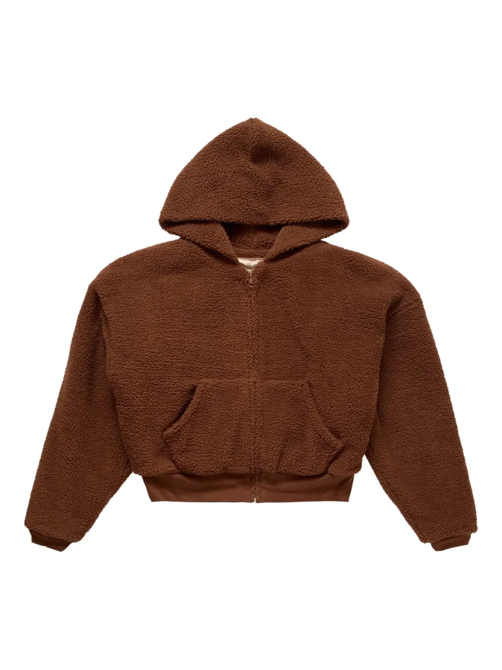marron texture polaire fermeture zippée poche kangourou col à capuche poignets côtelés