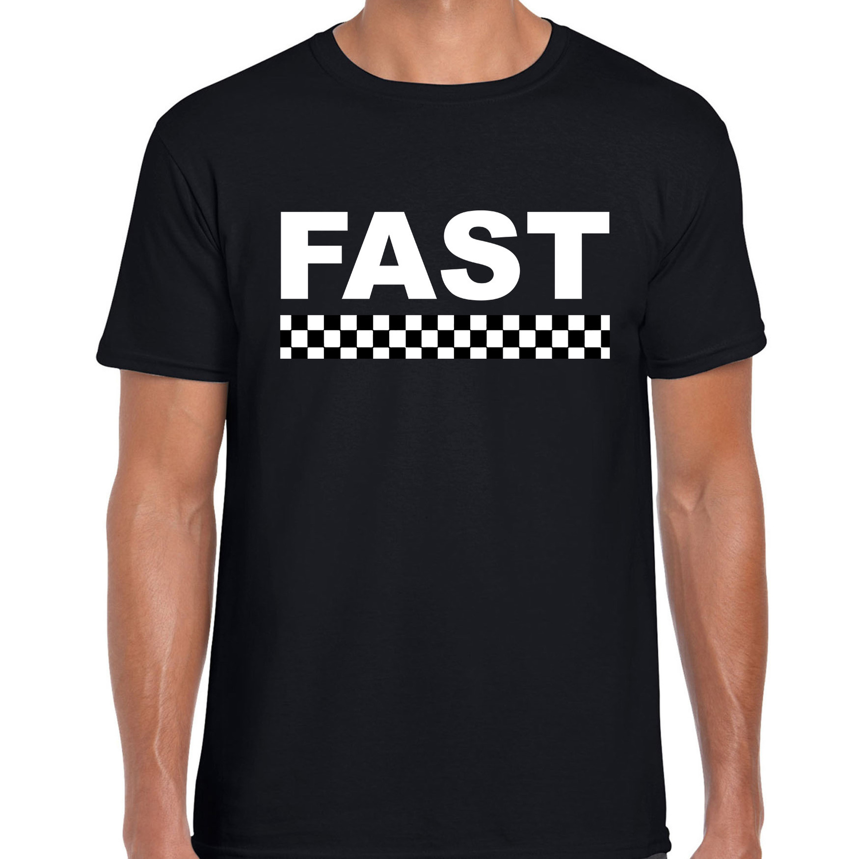 Fast coureur supporter / finish vlag t-shirt zwart voor heren. Het shirt is bedrukt met een finish vlag en de tekst: FAST. Een leuk shirt om cadeau te doen of om gewoon zelf te dragen.
