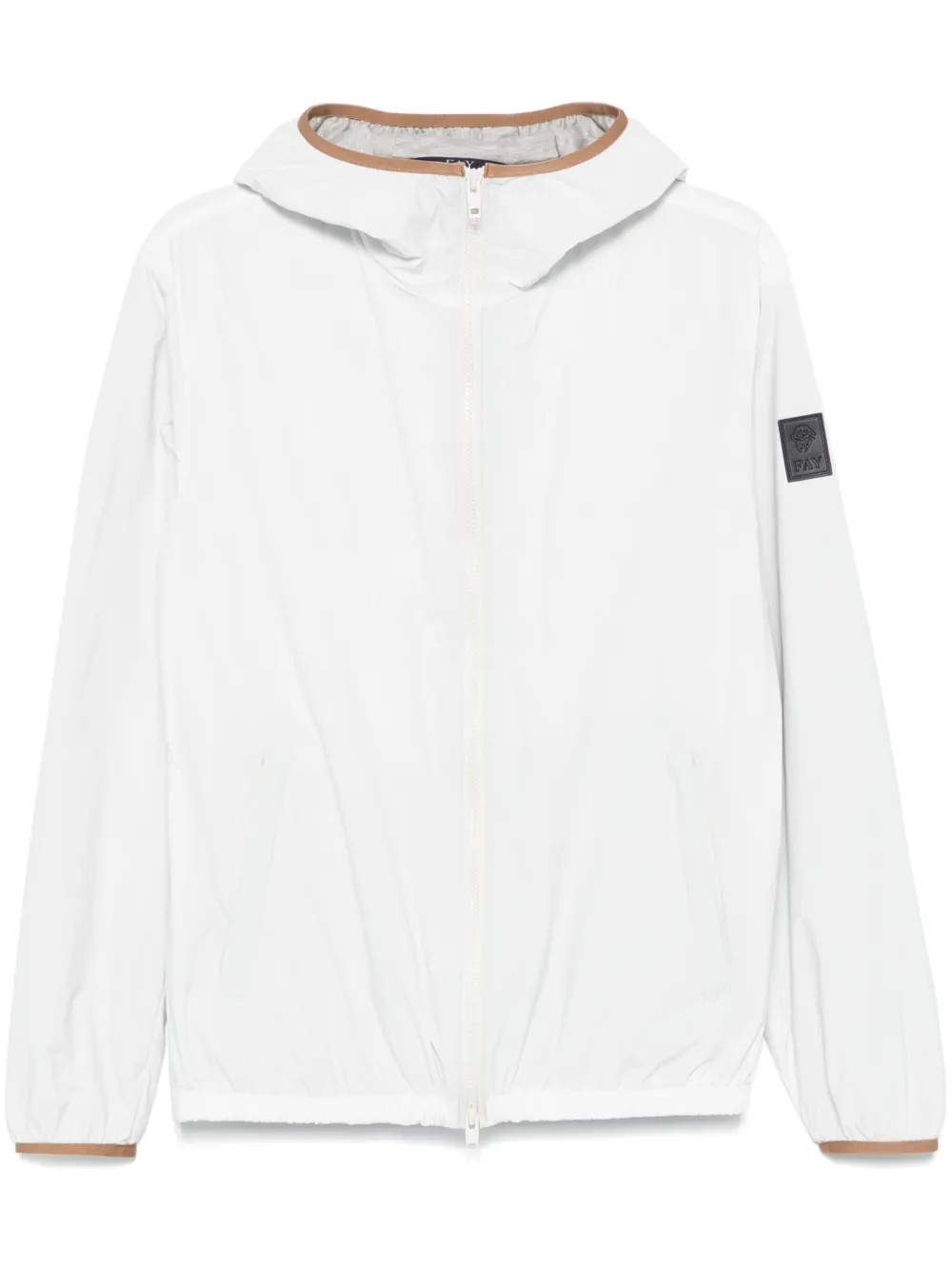 blanc capuche classique fermeture zippée à double sens sur le devant deux poches latérales zippées doublure en jersey