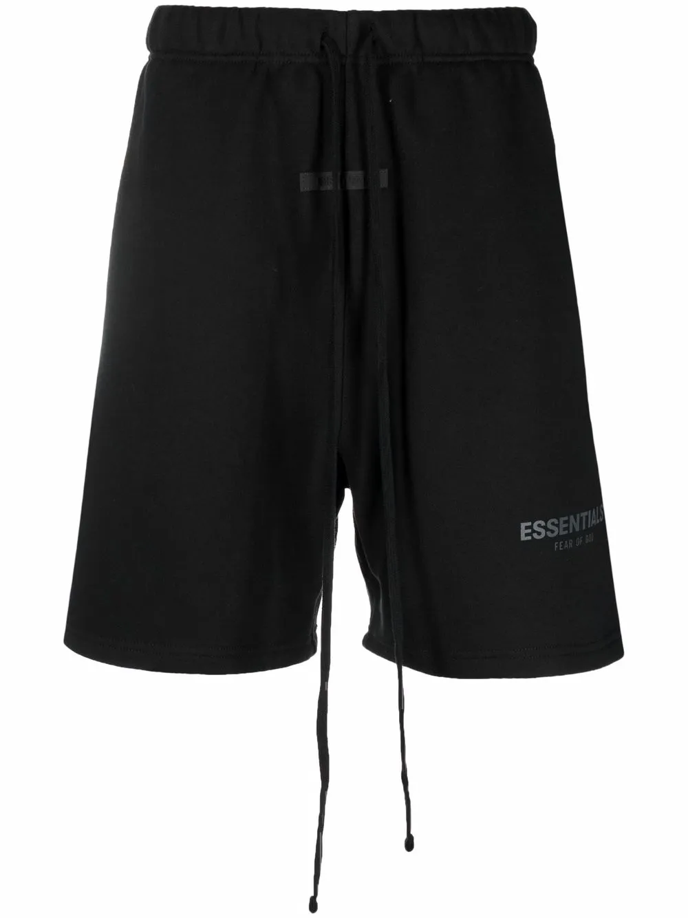 Logo imprimé sur le devant, taille élastique à lien de resserrage, poches latérales fendues, coupe droite, hauteur genou. Couleur : noir.