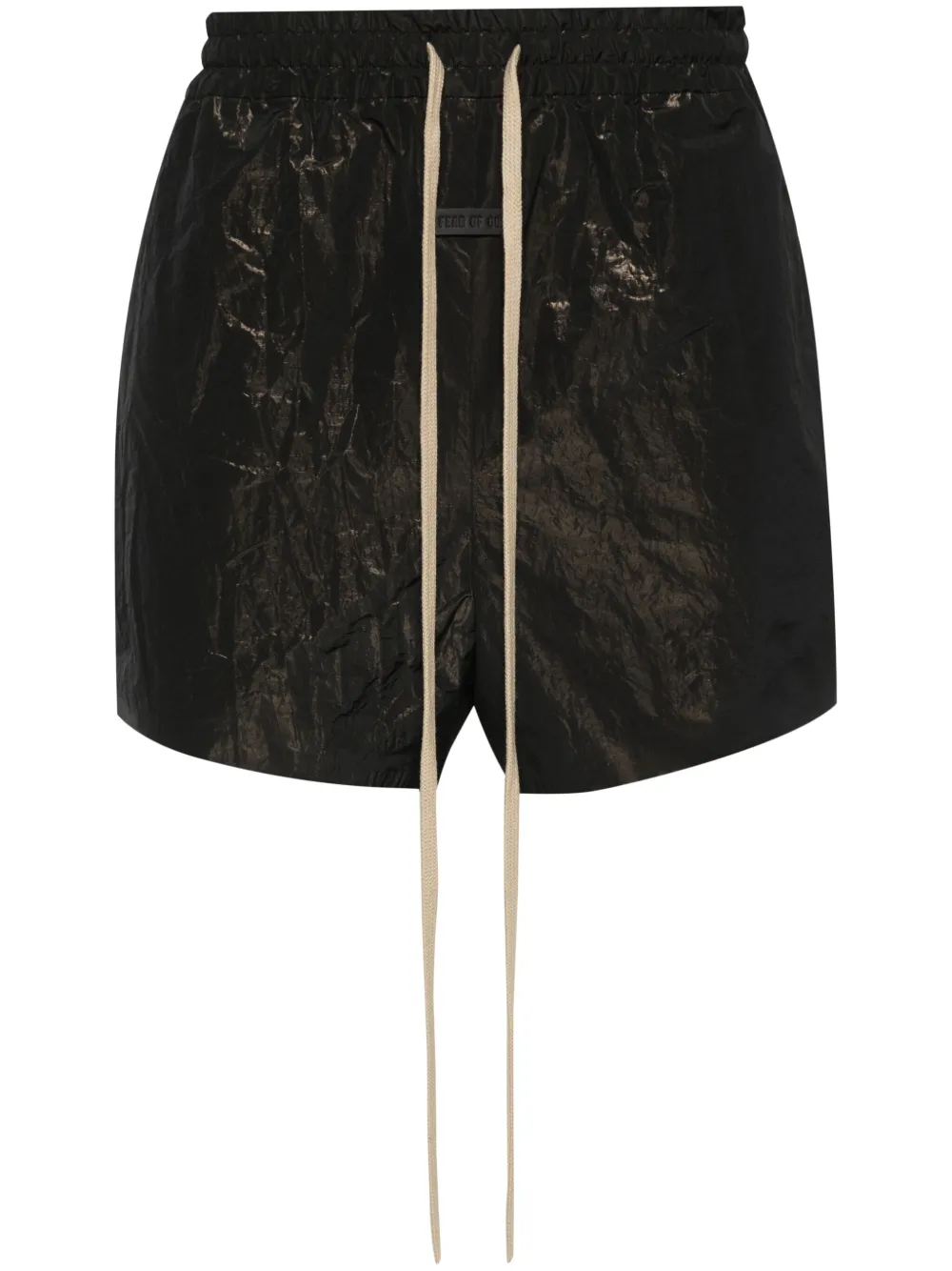 noir taffetas effet lamé patch logo sur le devant taille haute coupe courte poches plaquées latérales fentes latérales taille élastique à lien de resserrage doublure intégrale
