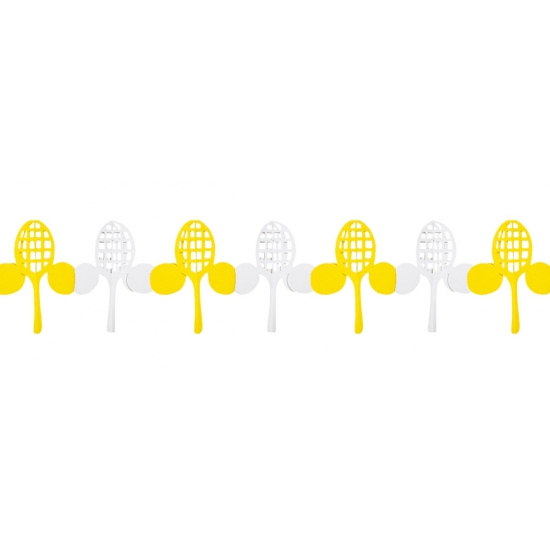 Feest sport thema slinger met tennisrackets en tennisballen. Materiaal: Papier. Lengte: 3 meter. Kleur: Wit met geel. De slinger is brandvertragend. Tennis thema feestartikelen en versieringen/decoraties.