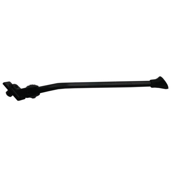 Fietsstandaard / achter standaard met einddop. De zwarte fietsstandaard is geschikt voor fietsen van 24, 26 en 28 inch en heeft een rubber voet. Materiaal: aluminium.