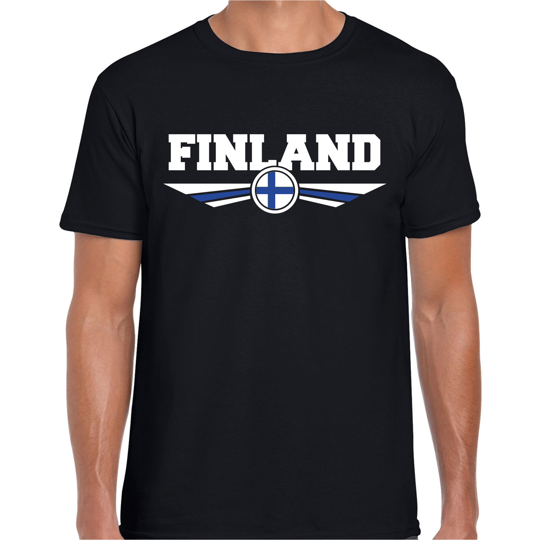 Finland landen t-shirt zwart voor heren. Op dit zwarte shirt met wapen staat in grote letters de tekst: FINLAND. Het wapen heeft de kleuren van de Finse vlag!
