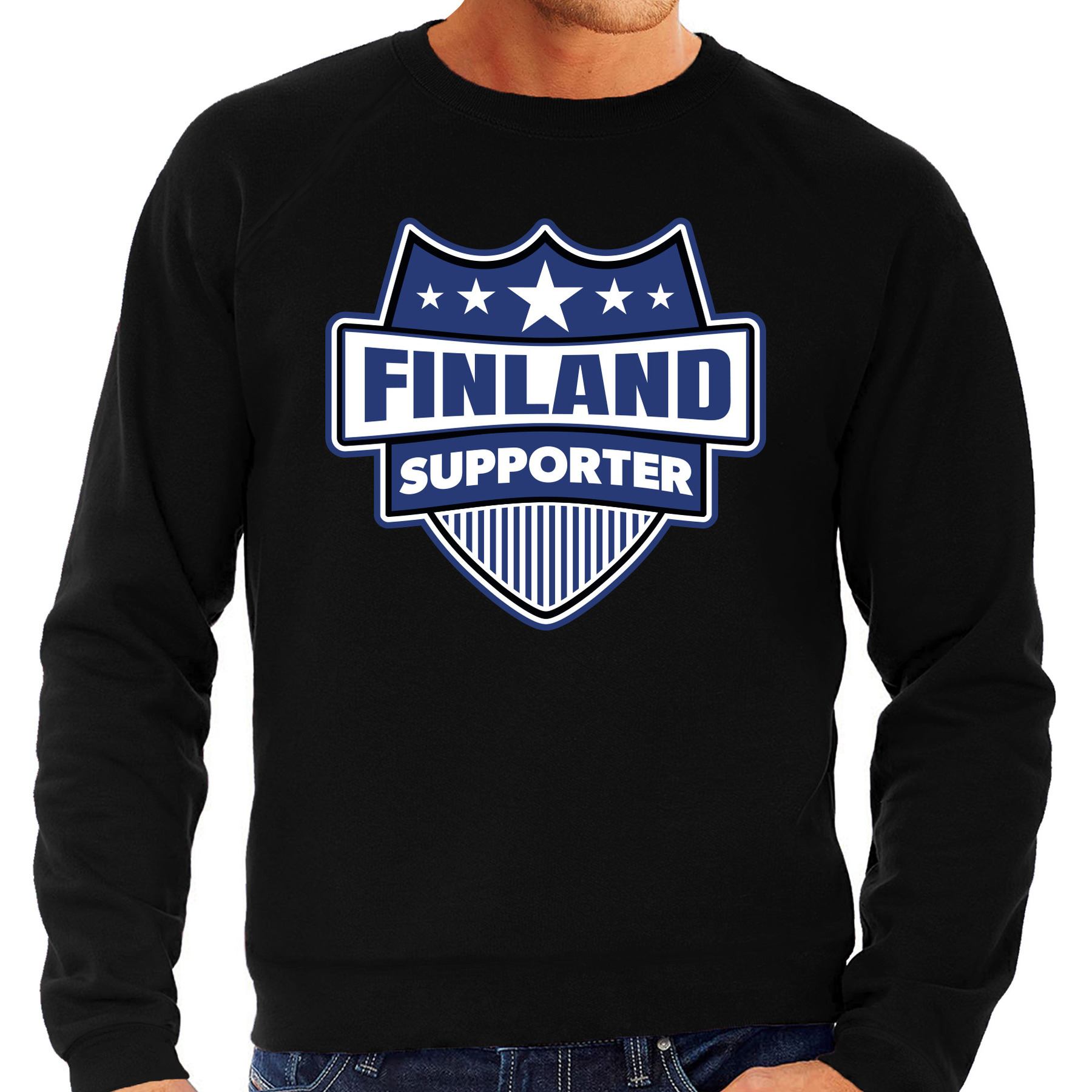 Finland schild supporter sweater zwart voor heren. Op deze zwarte sweater staat een schild met de tekst: Finland supporter. Het schild heeft de kleuren van de Finse vlag!