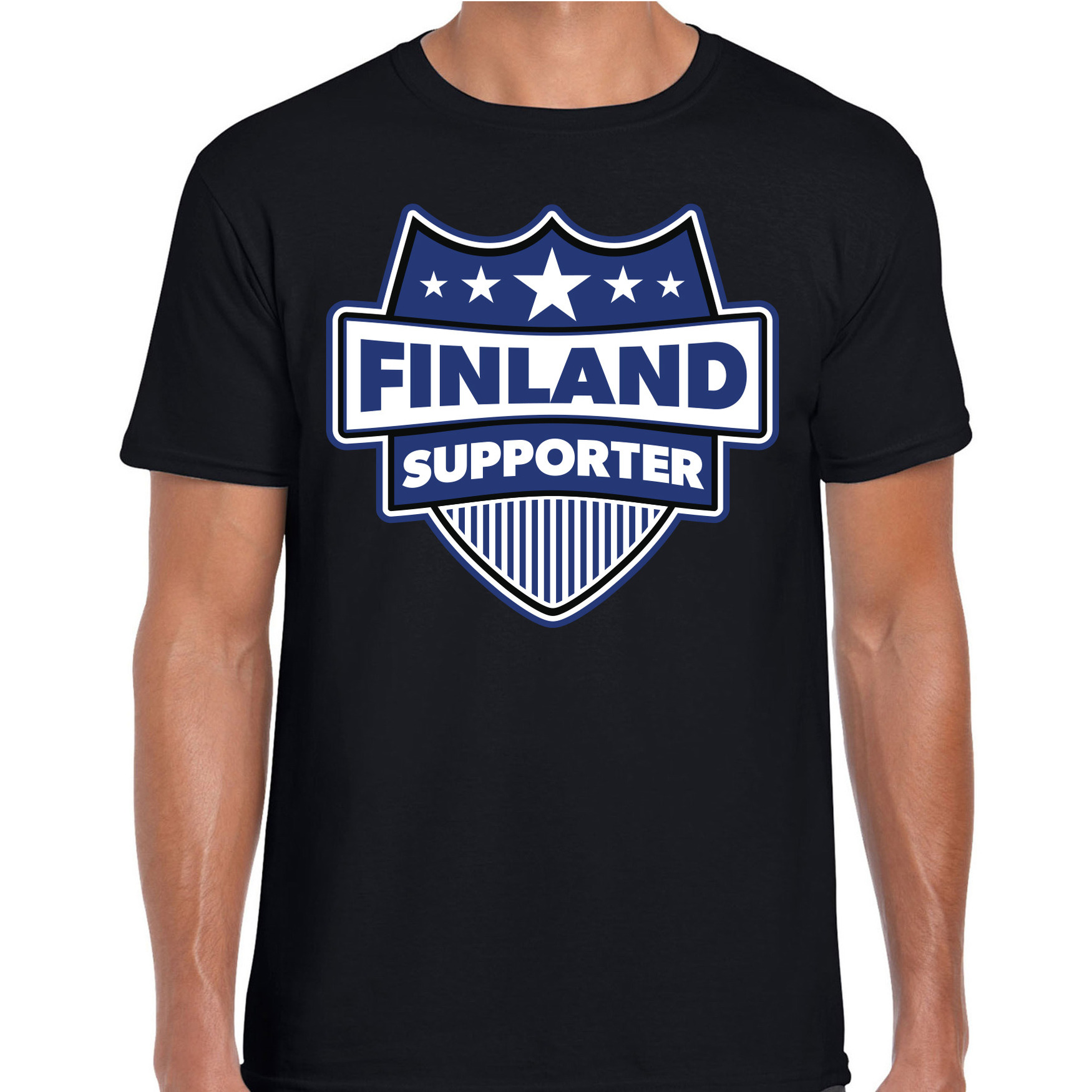 Finland schild supporter t-shirt zwart voor heren. Op dit zwarte t-shirt staat een schild met de tekst: Finland supporter. Het schild heeft de kleuren van de Finse vlag!