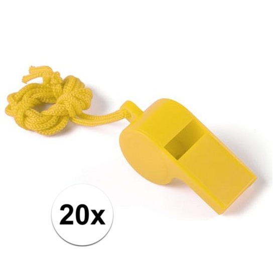 Fluitjes van kunststof voor kinderen en volwassenen. Multipack van 20x stuks voordelige fluitjes. Kleur geel. De fluitjes zitten aan een koordje. Herrie en geluid maken tijdens sport of spel.