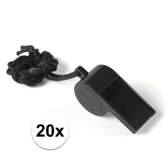 Fluitjes van kunststof voor kinderen en volwassenen. Multipack van 20x stuks voordelige fluitjes. Kleur zwart. De fluitjes zitten aan een koordje. Herrie en geluid maken tijdens sport of spel.