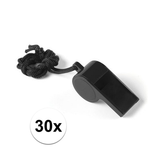 Fluitjes van kunststof voor kinderen en volwassenen. Multipack van 30x stuks voordelige fluitjes. Kleur zwart. De fluitjes zitten aan een koordje. Herrie en geluid maken tijdens sport of spel.