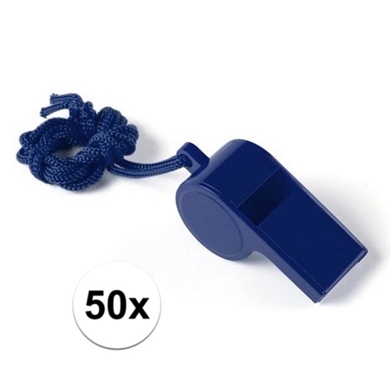 Fluitjes van kunststof voor kinderen en volwassenen. Multipack van 50x stuks voordelige fluitjes. Kleur blauw. De fluitjes zitten aan een koordje. Herrie en geluid maken tijdens sport of spel.