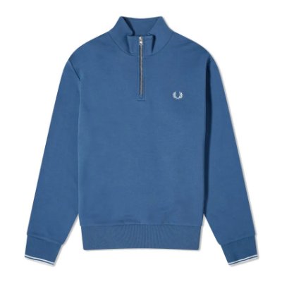 Fred Perry Half Zip sweater in het blauw (Midnight Blue) voor heren. Sportief design met het Fred Perry logo op de linkerborst. De Fred Perry sweater bevat een rits tot op de borst en de onderkant van de mouwen zijn voorzien van een dubbele streep. De twee strepen verwijzen naar de bekende twin tipped polo’s van Fred Perry. De sweater is een mooie combinatie van sport en streetwear. De Half Zip sweater van Fred Perry heeft een normale pasvorm. Materiaal: 79% katoen – 21% polyester.