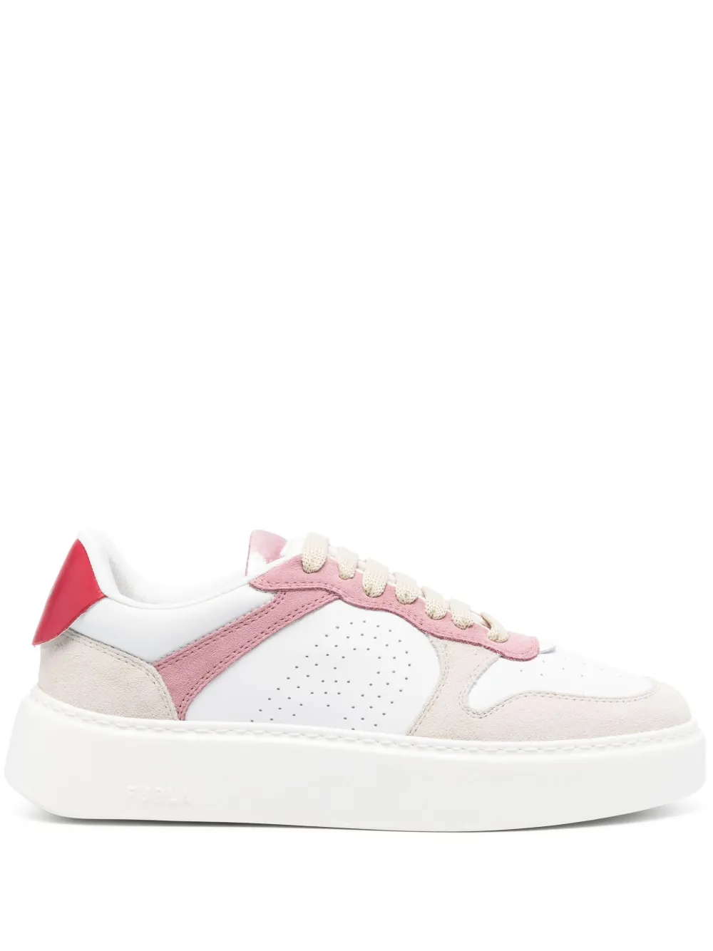blanc/beige/rose cuir de veau empiècements en daim design à empiècements colour block détails de perforations languette à patch logo contrefort contrastant griffé logo sur la semelle bout rond fermeture à lacer sur le devant semelle intérieure à logo semelle à plateforme