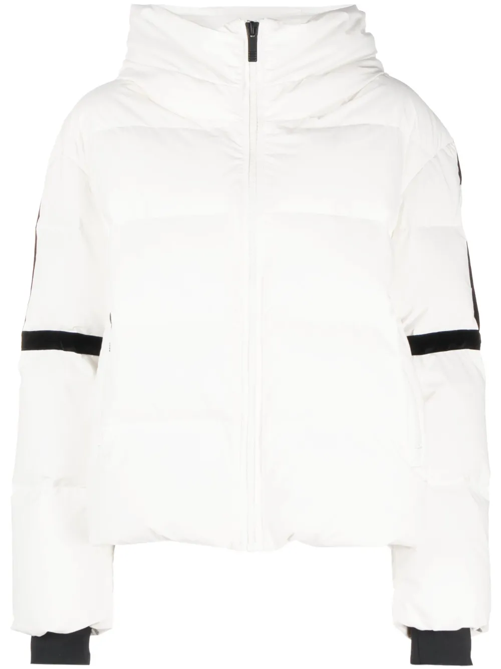 blanc/noir duvet design matelassé design matelassé patch logo sur le côté col cheminée capuche classique fermeture zippée devant manches longues poignets élastiqués poche zippée sur la manche poche intérieure poches latérales zippées jupe intégrée ourlet droit