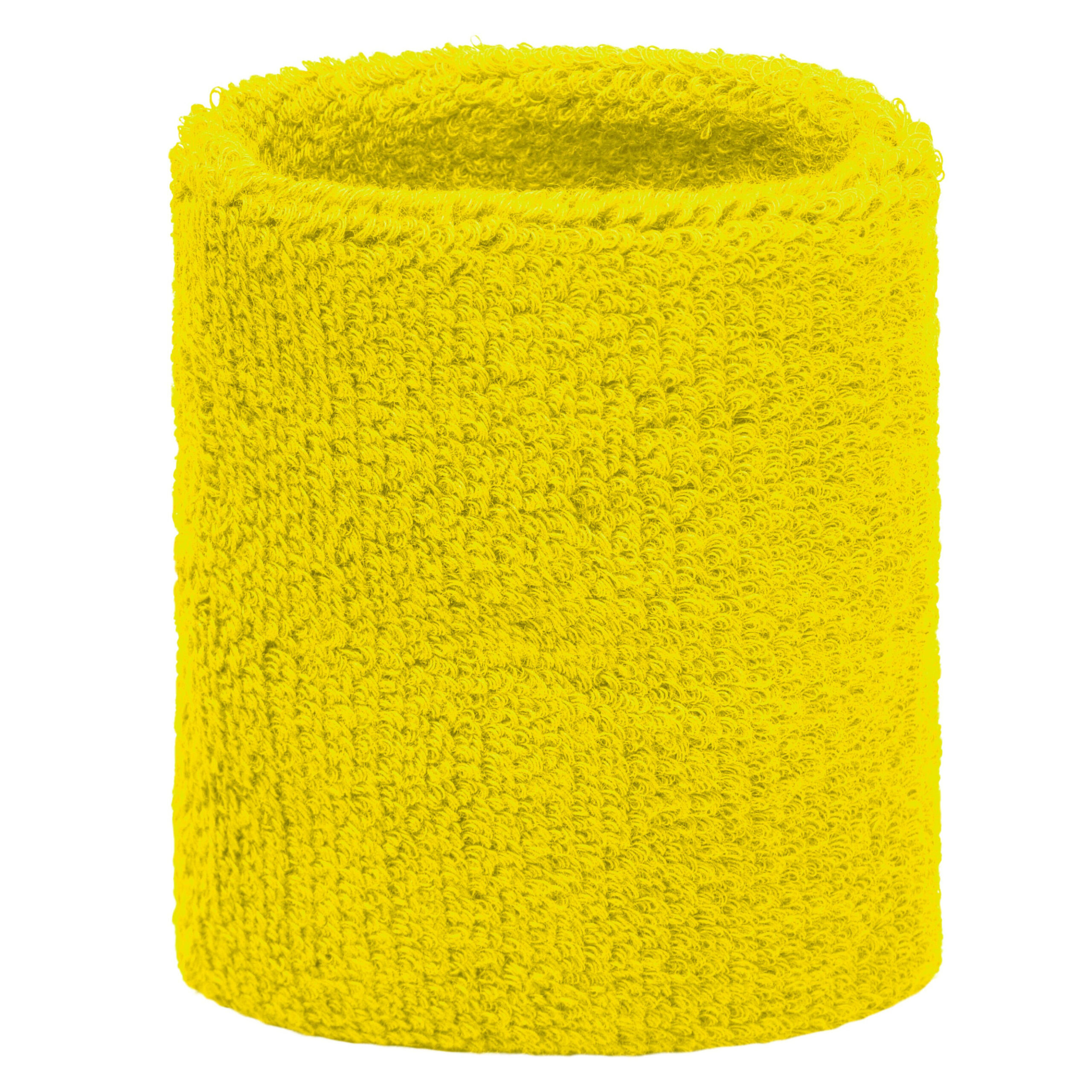 Geel zweetbandje voor pols. De zweetbandjes zijn 8 cm breed. Materiaal: 80% katoen en 20% elasthan. Gekleurde zweetbandjes voor een sportdag of evenement. Verkoop is per stuk!