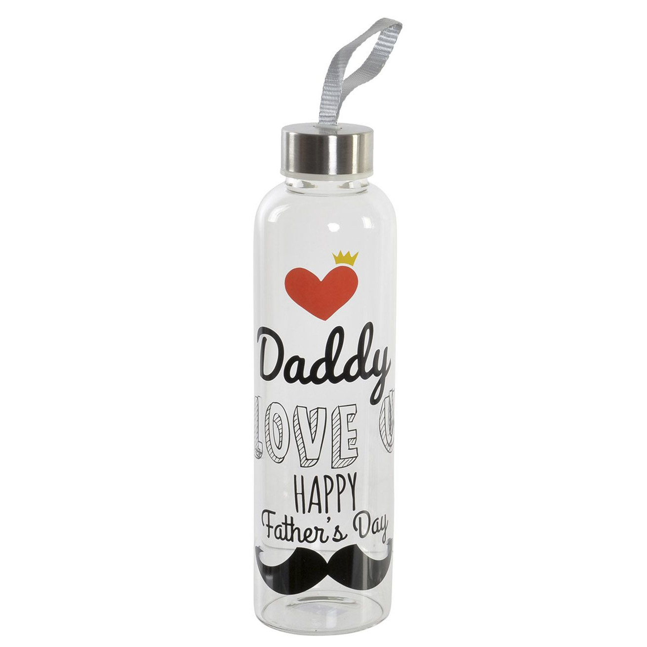 Glazen drinkfles Daddy I love you 550 ml Vaderdag cadeau. Een waterfles/drinkfles met de tekst Daddy I love you, happy fathers day. De fles heeft een hengsel voor makkelijk meenemen. Afmeting: ca. D6,5 x H23 cm. Inhoud: ca. 550 ml. Materiaal: glas met metalen dop. Vaatwasser geschikt: nee.