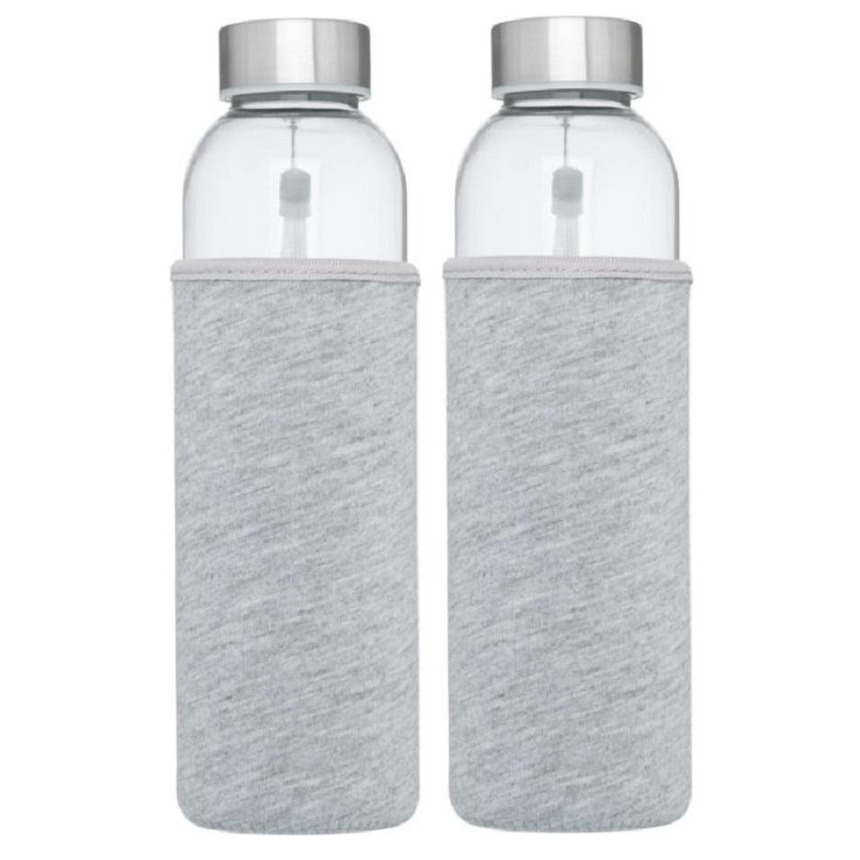 2 stuks glazen waterfles/drinkfles met softshell hoes in het grijs met handvat en kunststof schroefdop. Afmeting: ca. D6 x H22 cm. Inhoud: ca. 500 ml, 50 cl. Gewicht: 265 gram. Materiaal: verhard glas. BPA-vrij: ja. Geschikt voor magnetron: nee. Geschikt voor vaatwasser: nee. Geschikt voor vriezer: nee. De hoes is wasmachine geschikt. Sportfles of bidon.