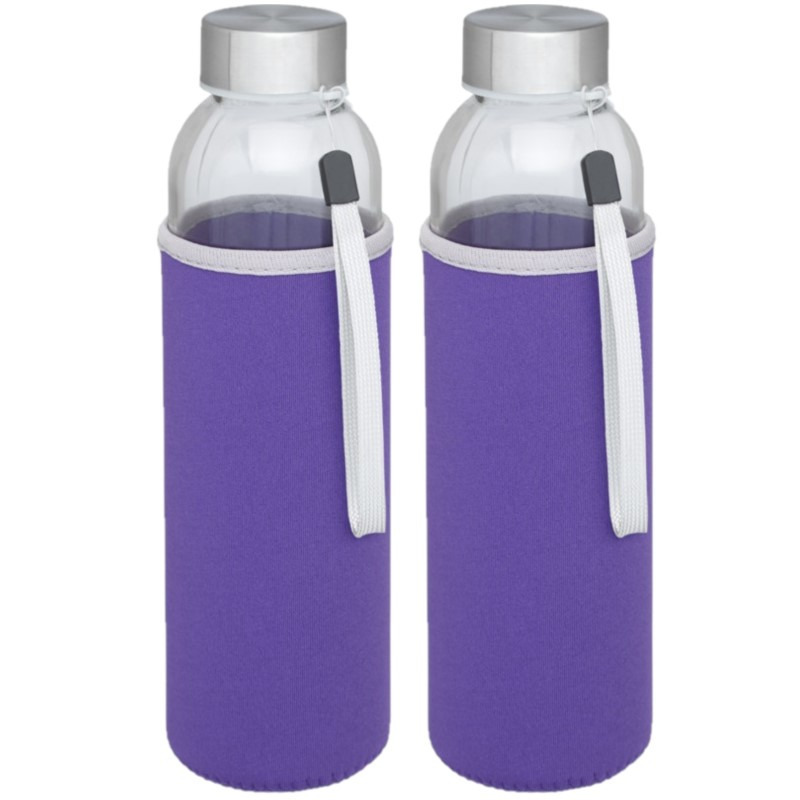 2 stuks glazen waterfles/drinkfles met softshell hoes in het paars met handvat en kunststof schroefdop. Afmeting: ca. D6 x H22 cm. Inhoud: ca. 500 ml, 50 cl. Gewicht: 265 gram. Materiaal: verhard glas. BPA-vrij: ja. Geschikt voor magnetron: nee. Geschikt voor vaatwasser: nee. Geschikt voor vriezer: nee. De hoes is wasmachine geschikt. Sportfles of bidon.