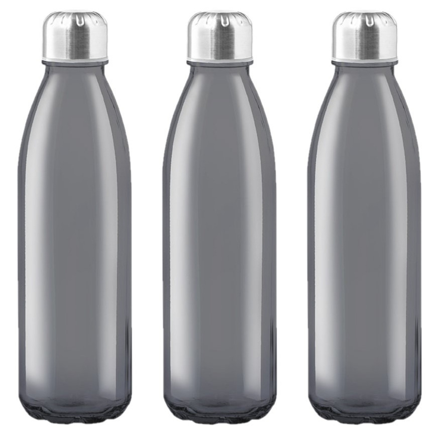 6 Stuks glazen waterfles/drinkfles/sport bidon in het zwart transparant met RVS dop. Afmeting: ca. D7 x H26 cm. Inhoud: ca. 650 ml, 65 cl. Gewicht: ca. 370 gram. Materiaal fles: verhard glas. BPA-vrij: ja. Geschikt voor magnetron: nee. Geschikt voor vaatwasser: ja, de dop niet. Geschikt voor vriezer: ja. Wordt geleverd in een kartonnen doosje.