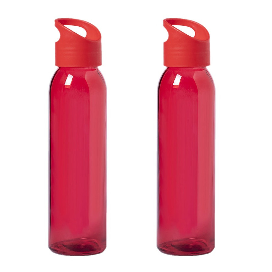 2 Stuks glazen waterfles/drinkfles met schroefdop en handvat in de kleur transparant rood en inhoud van 470 ml. Afmeting: ca. D6,5 x H25 cm. Inhoud: ca. 470 ml, 47 cl. Gewicht: ca. 314 gram. Materiaal fles: verhard glas. BPA-vrij: ja. Geschikt voor magnetron: nee. Geschikt voor vaatwasser: nee. Geschikt voor vriezer: ja. Wordt geleverd in een kartonnen doosje.