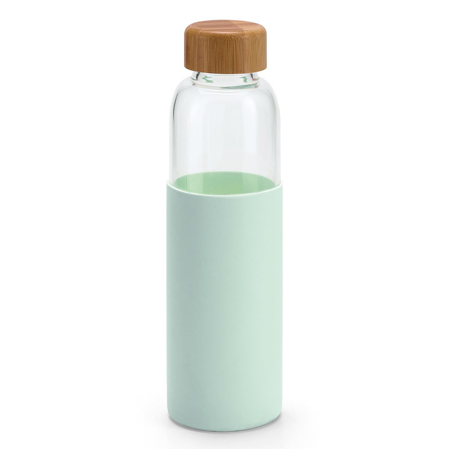 Glazen sport waterfles/drinkfles met mintgroen siliconen beschermhoes en bamboe houten schroefdop. Afmeting: ca. D6,5 x H23 cm. Inhoud: ca. 600 ml, 60 cl. Materiaal: verhard borosilicaat glas. BPA-vrij: ja. Geschikt voor magnetron: ja. Geschikt voor vaatwasser: ja, de dop niet. Geschikt voor vriezer: ja.