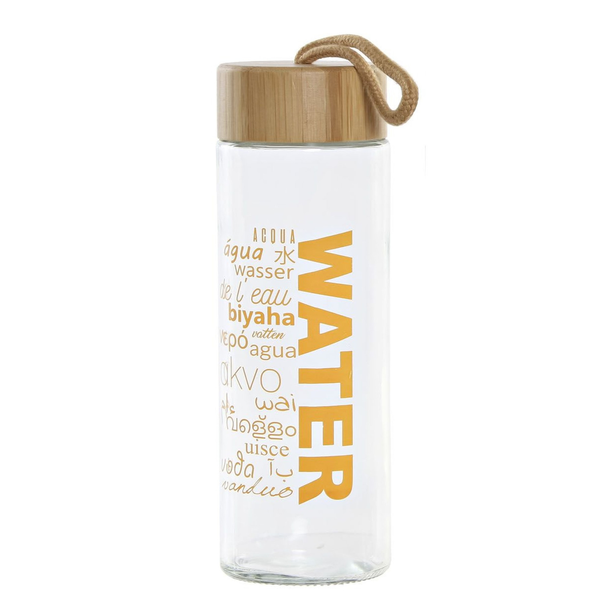 Glazen waterfles/drinkfles oranje transparant met touwtje. Inhoud: ca. 580 ml, 58 cl. Afmetingen: D7 x H21 cm. BPA-vrij: ja. Geschikt voor magnetron: nee. Geschikt voor vaatwasser: ja.