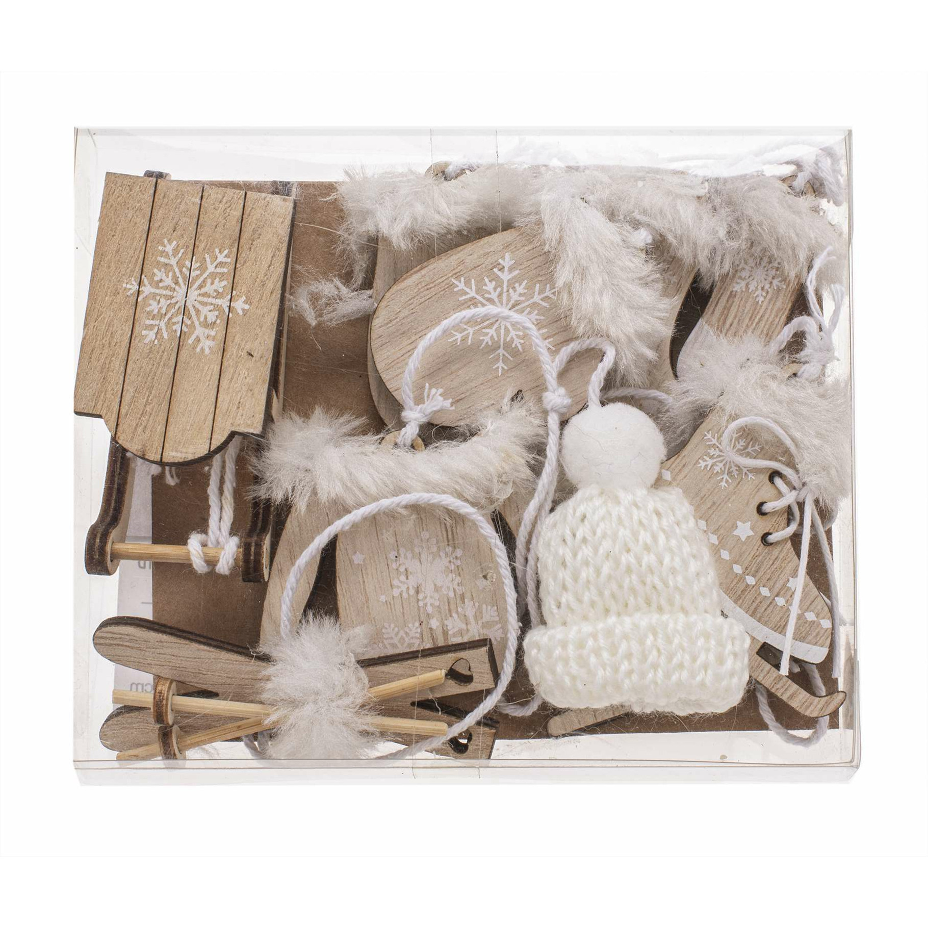 Kersthangers/kerstornamenten winter thema. Deze set van 10x stuks kersthangers in wintersport thema is een perfecte manier om de kerstboom een unieke en leuke look te geven. De kerstornamenten zijn gemaakt van hout, bruin met wit van kleur en hebben een formaat van ongeveer 5/6 cm. Diverse kersthangers zoals schaatsen, handschoenen, sleetjes.