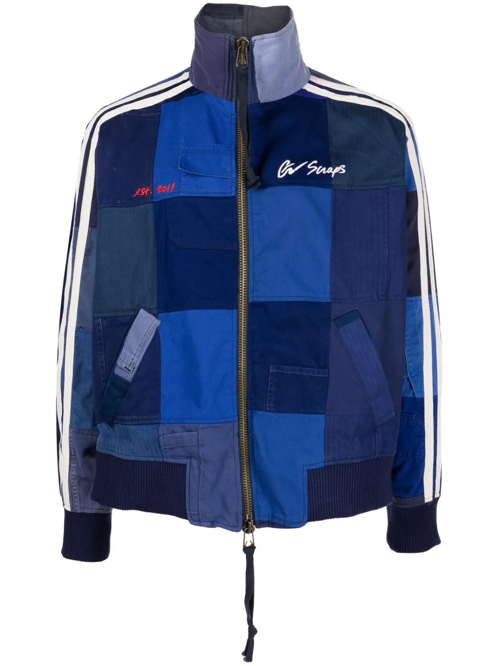 Bleu, multicolore, coton, design patchwork, logo brodé sur la poitrine, col montant, fermeture zippée à double sens sur le devant, manches longues, poches latérales fendues, ourlet droit. .