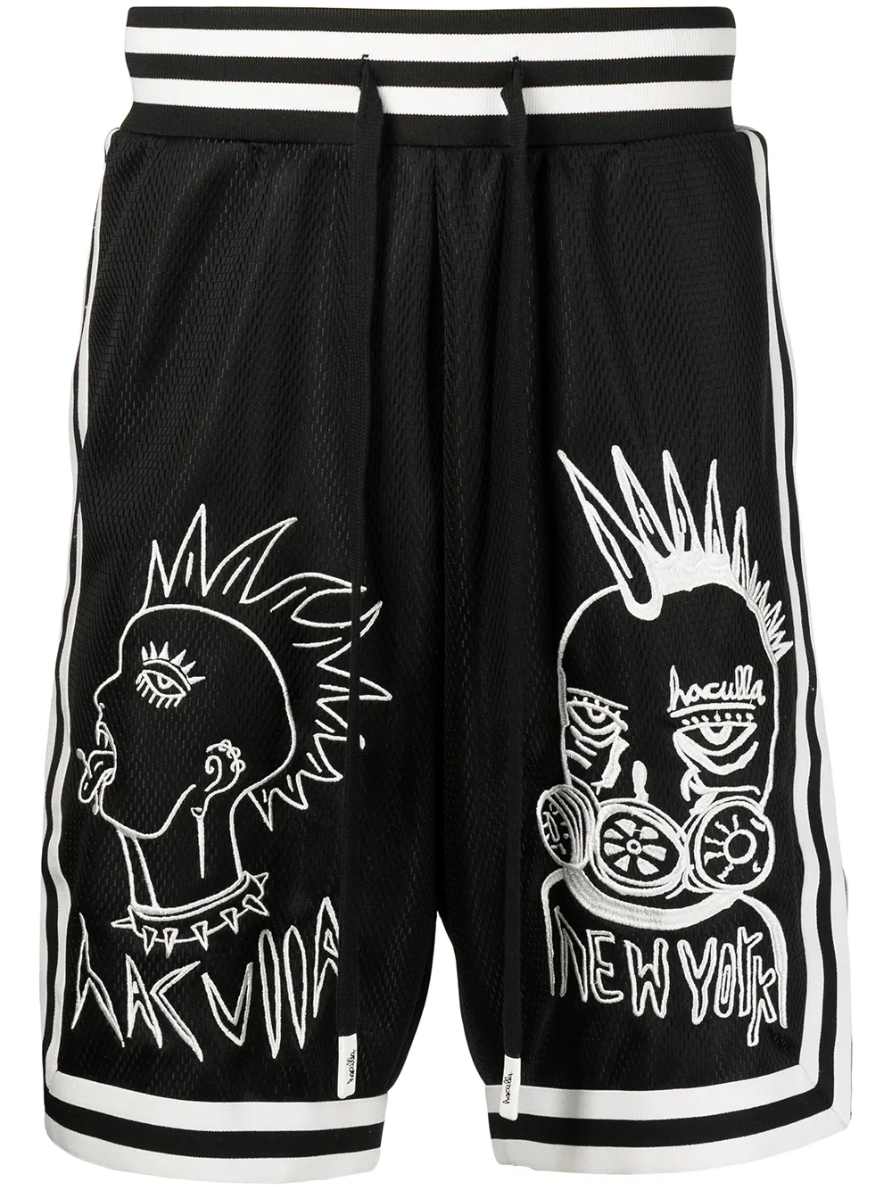 Empiècement en mesh, bord rayé, motif brodé, logo brodé sur le devant, taille élastique à lien de resserrage, poches latérales fendues, fentes latérales, hauteur genou. Couleur : noir.
